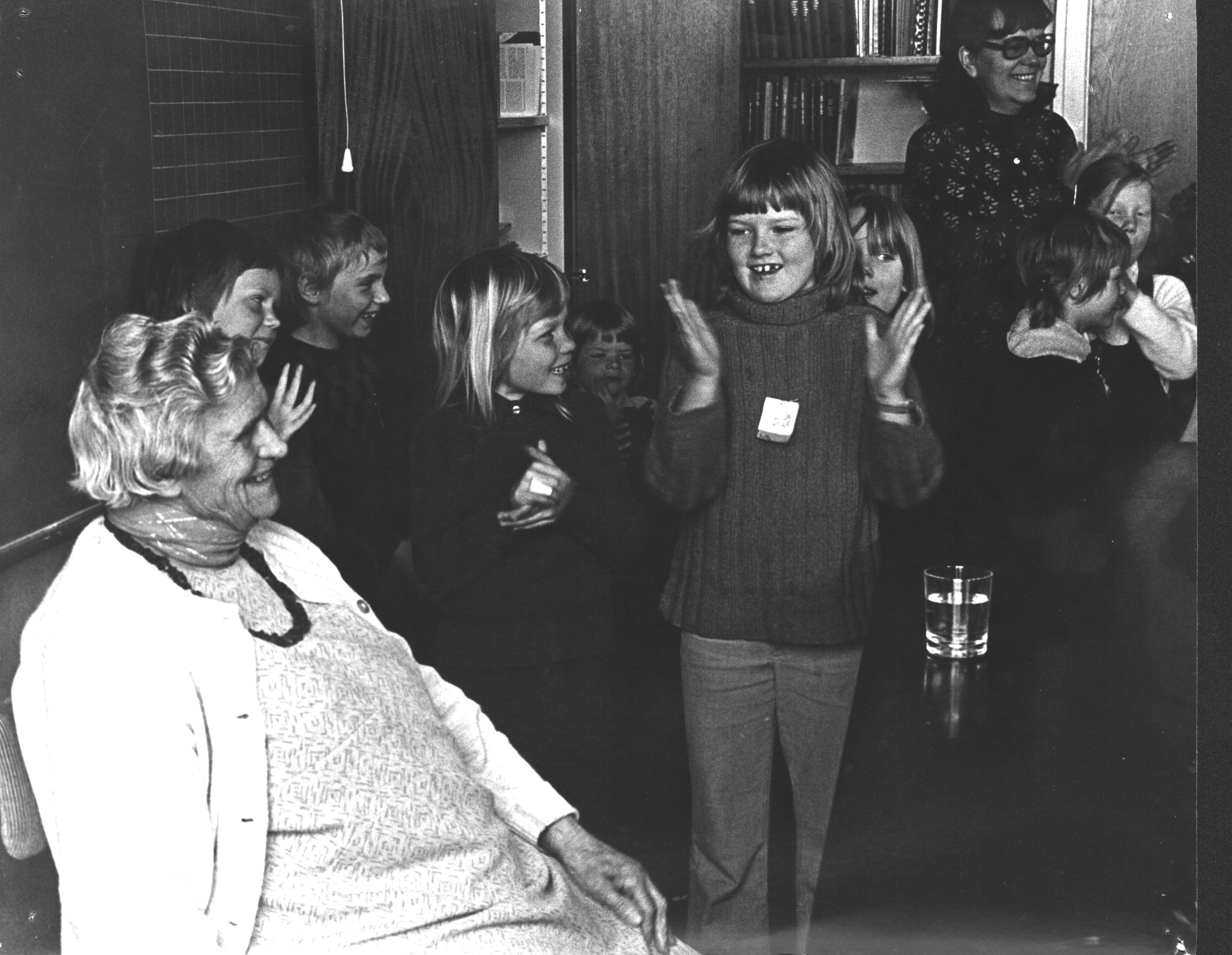 Andrea Madsen, den ældre dame i forgrunden, lærer børnene gamle sange.
