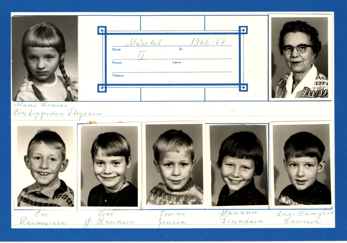 | 2. klasse MÅRSLET SKOLE 1966. Ark 1. Øverst fra venstre: - Annette Andersen - Lars Schmidt - Kathe Rasmuussen - Per Bech Thygesen - Tove Nielsen - Henrik Madsen - Kirsten Dybvad Larsen - Søren Schmidt - Lisbeth Jensen - Rene Egholm Ark 2. Øverst fra venstre: - Marie Louise Pontoppidan Thyssen - Lærerinde Johanne K. Nielsen - Ove Rasmussen - Tove S. Knudsen - Tonni Jensen - Mariann Frandsen - Lars Kamgaard Laursen Ark 3. Øverst fra venstre: - Inger Marie Kristensen - Carsten Pedersen - Bente Tornbjerg - Jens Peter Sørensen - Hanne Pedersen - Peter Dall - Niels Borgbjerg - Svend Åge Jensen - Mads Kjær - | |