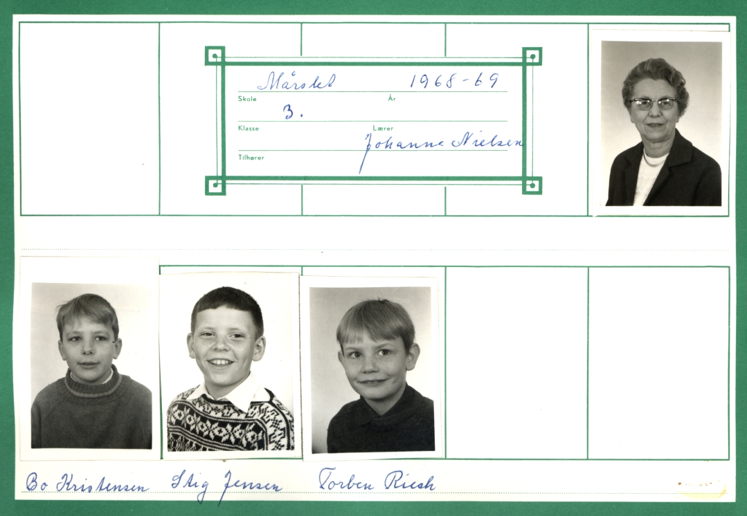| 3. klasse MÅRSLET SKOLE 1968-69. Ark 1. Øverst fra venstre: - Vagn Thomsen - Michael Beran? - Gert Rosendal - Steen Raunkjær - Kim Smerup Nielsen - Bent Cramer - Morten Sørensen - Per Mikkelsen - Flemming Kristiansen - Jesper Persson Ark 2. Øverst fra venstre: - Lærerinde Johanne K. Nielsen - Bo Kristensen - Stig Jensen - Torben Rieck Ark 3. Øverst fra venstre: - Jytte Andersen - Annette Hansen - Karen Philipsen - Johanne Jensen - Anne Grethe Svarke - Henriette Nielsen - Lene Nielsen - Hanne Birkegaard - Annette Beckmann | |