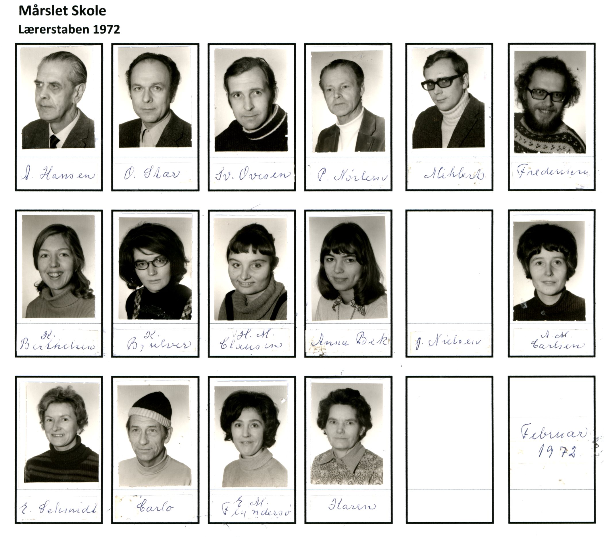 6) Kaj Frederiksen, rejste til en af skolerne i vestbyen. Mårslet Skole var ikke "moden" til ham endnu. Han havde "stort" hår, han kom i røde, hjemmestrikkede sokker og træsko. det var lidt morsomt.