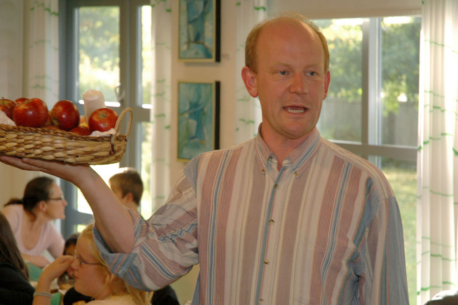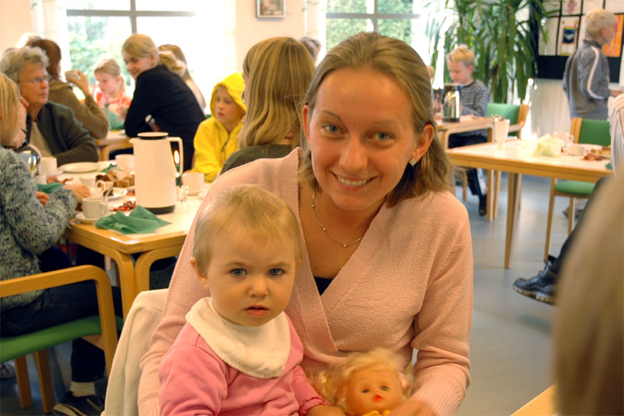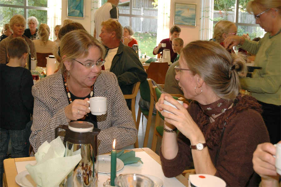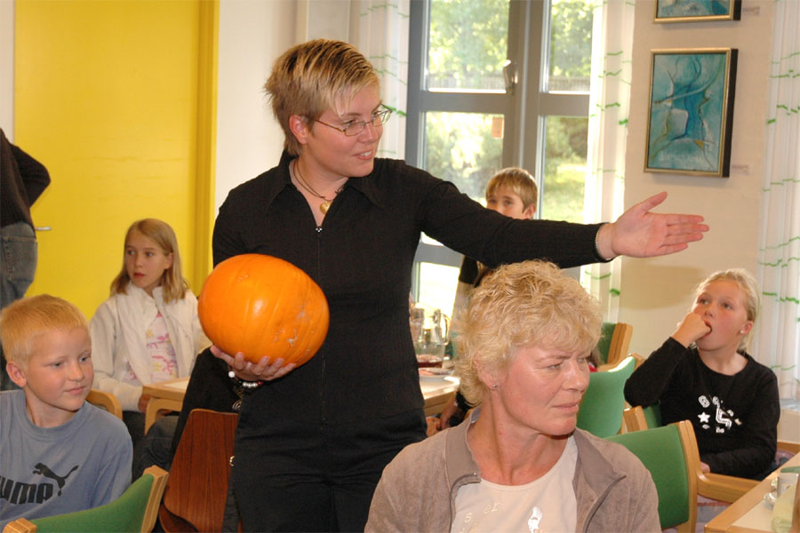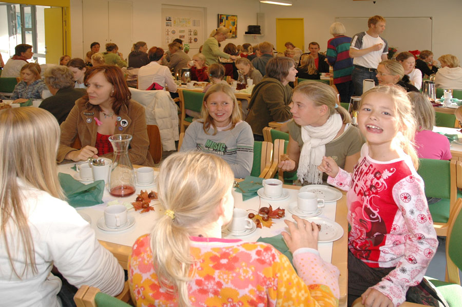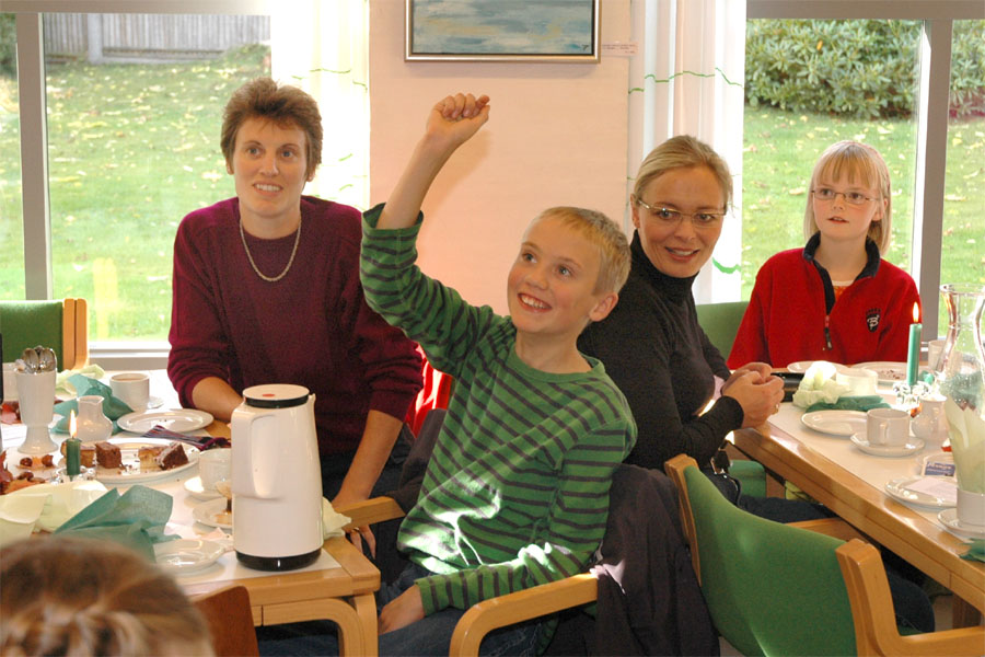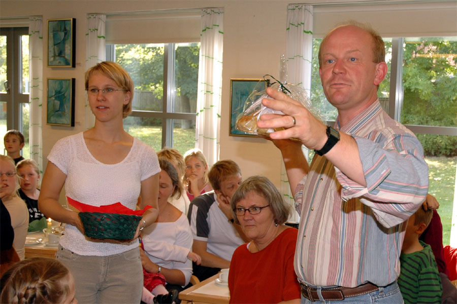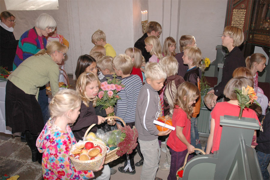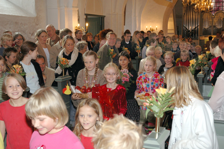 | Mårslet kirke var næsten helt fyldt søndag eftermiddag den 9. oktober. Det var den årlige høstgudstjeneste, der former sig som en familiegudstjeneste, hvor børnene bærer kurve ind i kirken med blomster, frugter, bagværk, og hvad der ellers symboliserer sommeren og efterårets høst. Efter gudstjenesten blev det hele bragt over i sognehuset, hvor der var dækket op til kaffe, the, sodavand og masser af kage og boller. Her blev hele høsten solgt på en festlig auktion styret af den nye sognemedhjælper Mette Grøn Bugge og menighedsrådsmedlem Ebbe Nørgaard Pedersen som auktionarius. Det blev til et rekordstort overskud på 2.681 kr., som går til Folkekirkens Nødhjælp. foto: ©2005 Jørgen Lauritsen