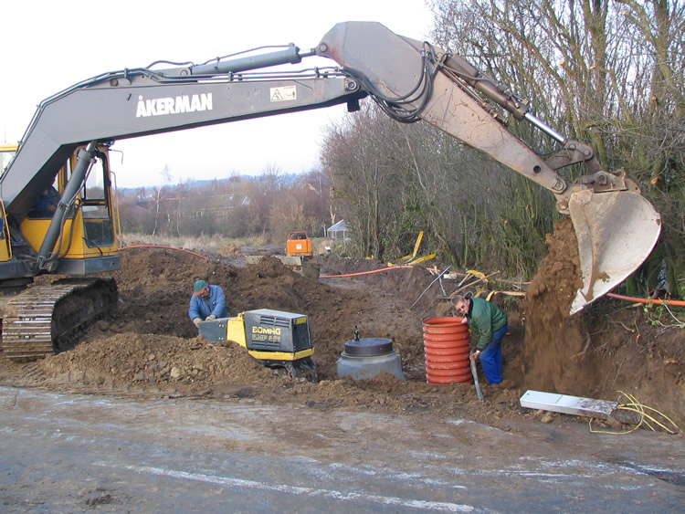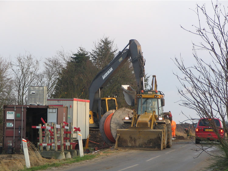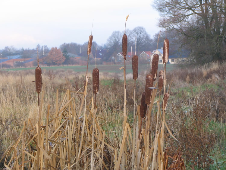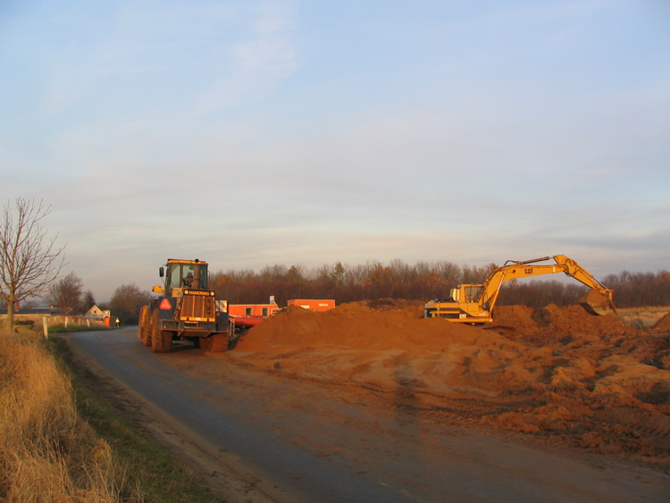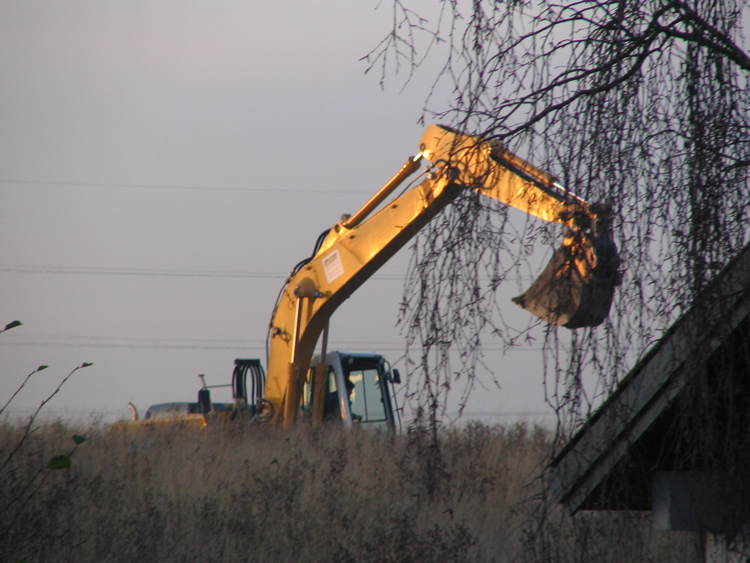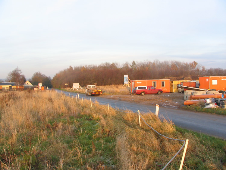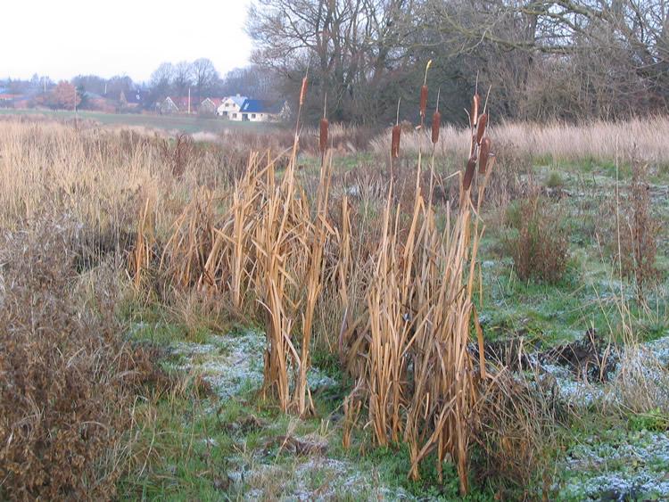 | Hvor hurtig er naturen til at genoprette mange års agerbrug? Hurtigere end man skulle tro! På området vest for Ovesdal gik der i sommer ænder og snadrede, og nu står der den flotteste gruppe dunhamre. Ser man på Kort- og Matrikelstyrelsens historiske kort ses det tydeligt, at der har været et lille engdrag her for 100 år siden og det kunne der åbenbart hurtigt blive igen. Den kommende maskinelle behandling kommer naturen nu næppe over ved egen kraft! Mænd og maskiner går til den på begge sider af Tandervej foto: ©2005 Keld Schmidt-Møller
