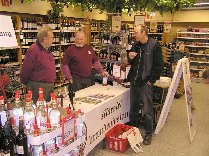 | Mårslet Brændevinslav står med smagsprøver og salg af poser af årets julesnaps i denne weekend i Mårslet brugs foto: ©2005 Jesper Andersen