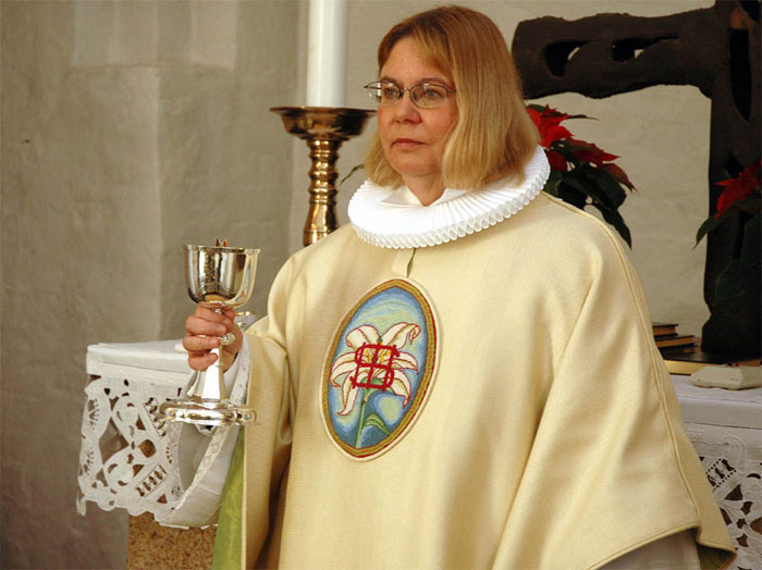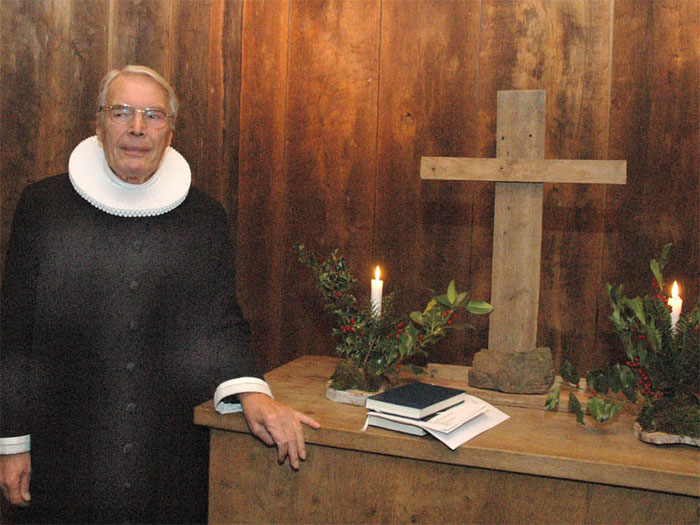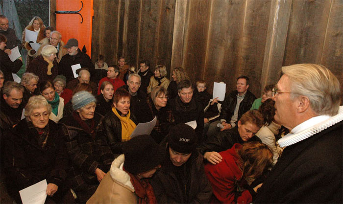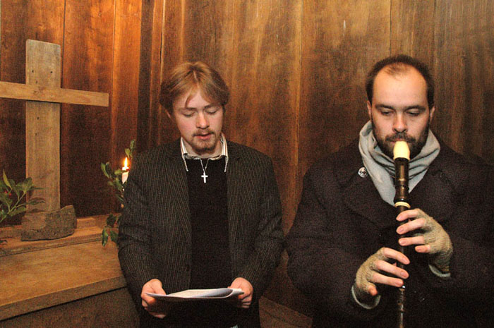 | Mon ikke en del af de mange mårslettere, der gik forgæves til Mårslet kirke juleaften, fandt vej til Stavkirken ved Moesgård Museum. Der var i hvertfald fuldt hus med omkring 70 mennesker inde i det spartanske kirkerunm og vel 20 udenfor. Alle fik dog en fin juleaftensoplevelse med præst Torben Rostbøll, der prædikede over juleevangeliet. Salmerne var de velkendte, da det - pga. det svage lys - var svært at følge med på det udleverede tekstblad. Den ledsagende musik blev leveret af Christoffer Bech på fløjte og kirkesanger var Rasmus Frandsen. Som kirketjener og klokker så vi Jens Bech, som iøvrigt var initiativtager til denne julegudstjeneste. Og så blev den hvide af de to nye messehageler taget i brug for første gang af sognepræst Hanne Davidsen ved julegudstjenesten 1. juledag i Mårslet Kirke. Der var i dagens anledning indlagt et lille bogmærke i salmebøgerne, hvorpå motiverne var afbilledet. foto: ©2005 Jørgen Lauritsen