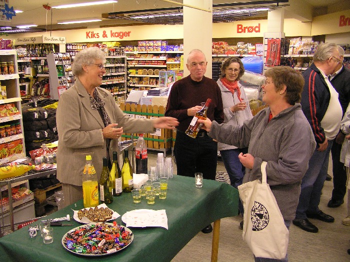 | Ved receptionen overrækker Mårslet Brændevinslaugs Kirsten Schmidt-Møller hende en flaske kryddersnaps, som tak for det gode samarbejde, der har været - og er - mellem SuperBrugsen og Brændevinslauget gennem årene. foto: ©2006 Jesper Andersen
