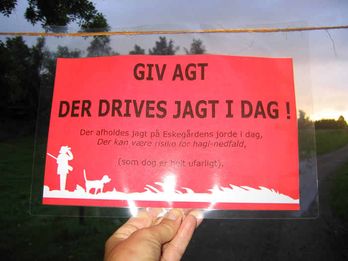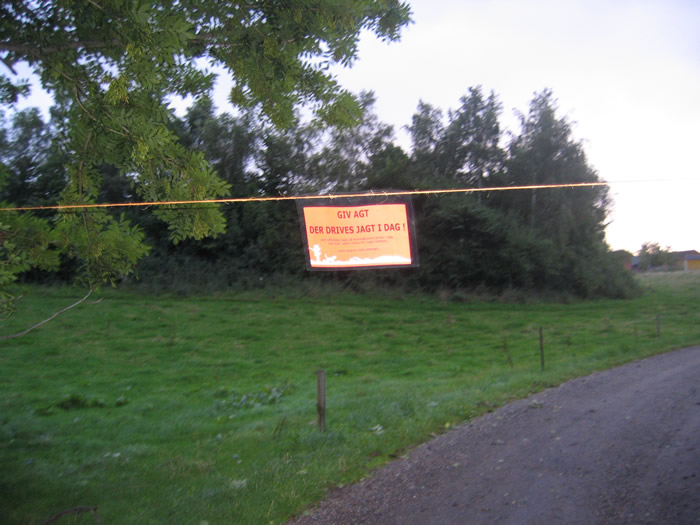 | Det gik livligt for sig tidligt i Mårslet i morges. Kl. 7 var en gruppe jægere på morgenjagt på skovduer på den lille trekantede kile mellem Giber Å og den yderste del af Eskegårdsvej. De havde gjort sig omhu med sikkerheden for de gående på Eskegårdsvej - bl.a. var Eskegårdsvej blevet markeret med advarsel og en snor tværs over vejen. foto: ©Birthe Jørgensen