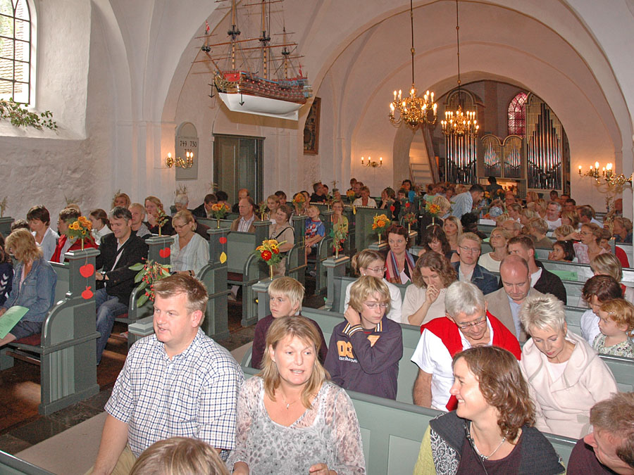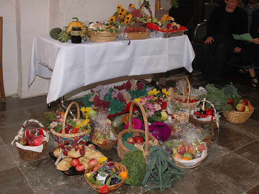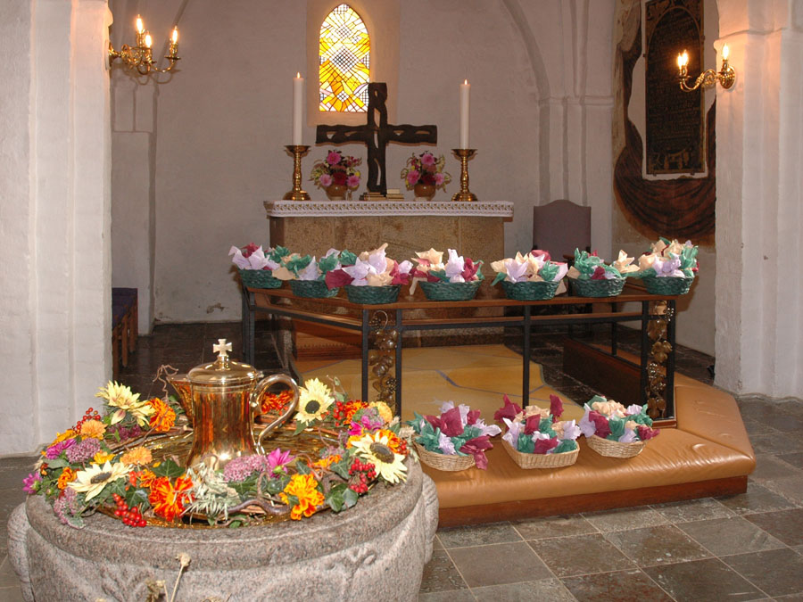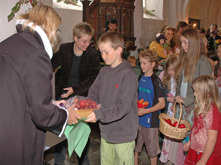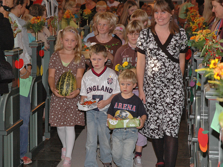 | Mårslet Kirke var smukt pyntet med blomster i efterårets farver, da der på denne smukke sensommerdag blev afholdt den traditionelle høstgudstjeneste. Børn fra Mårslet Skole bar eksempler på sommerens afgrøder ind i kirken, og sognepræst Hanne Davidsen prædikede over en lignelse af Johannes Jørgensen om edderkoppen, der tror den kan alt selv og glemmer sin livline fra oven, og hvor gruelig galt det så går, når den bliver klippet. Efter gudstjenesten var der festlig sammenkomst i Sognehuset, hvor der blev holdt auktion over alle afgrøderne. To veloplagte "auktionariusser", Ebbe Nørgård Pedersen og Mette Grøn Bugge, styrede løjerne, og i alt kom der 2.937,50 kr. ind, der ubeskåret går til Folkekirkens Nødhjælp. Største enkeltpost var en glasskål med brød og frugt, der gik for 500 kr. JL foto: ©2006 Jørgen Lauritsen