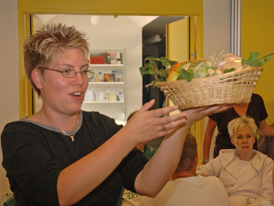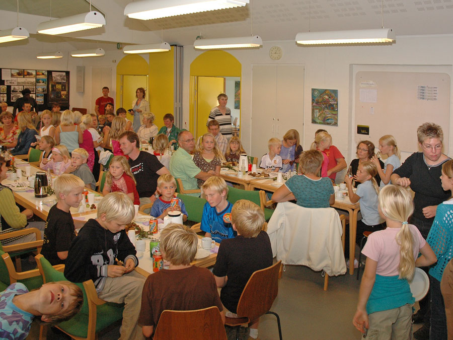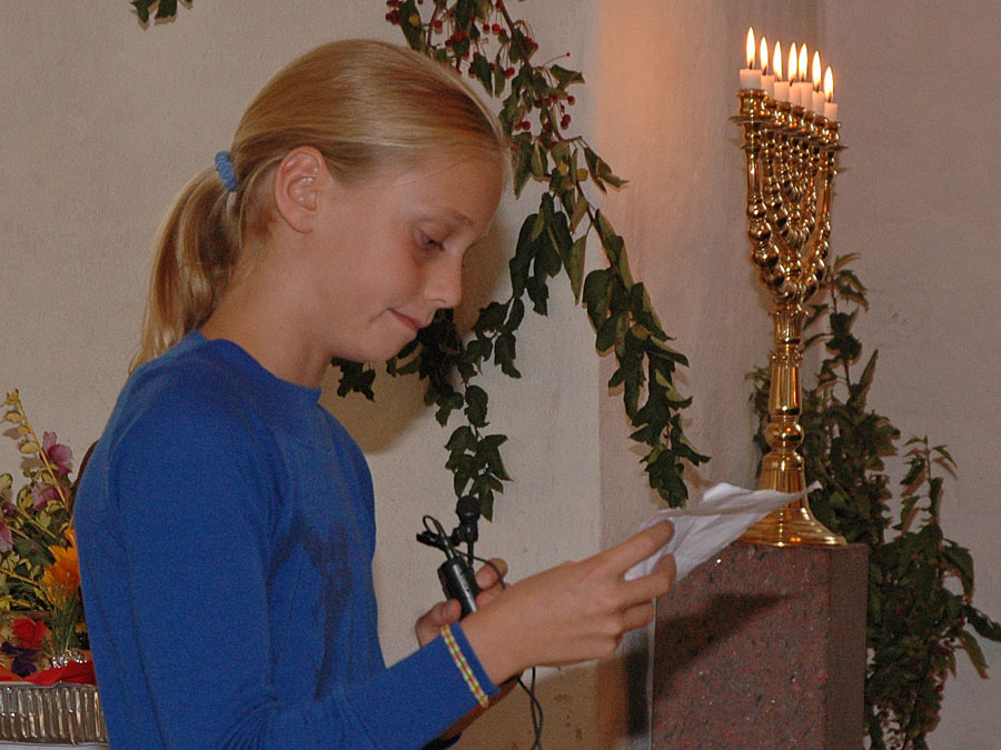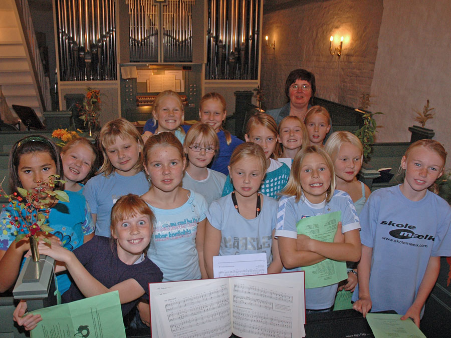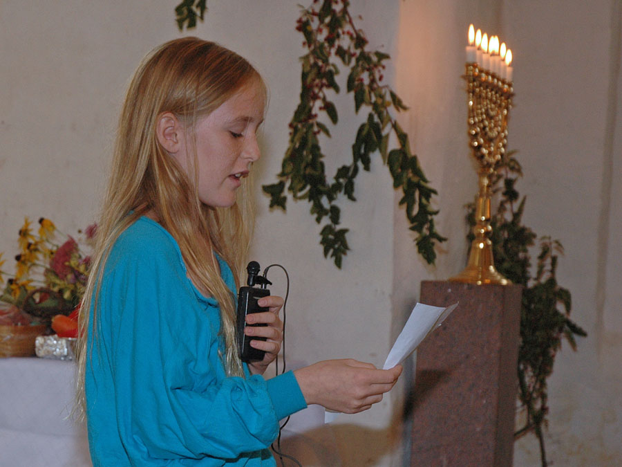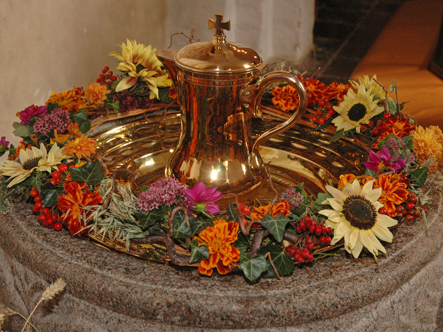 | Mårslet Kirke var smukt pyntet med blomster i efterårets farver, da der på denne smukke sensommerdag blev afholdt den traditionelle høstgudstjeneste. Børn fra Mårslet Skole bar eksempler på sommerens afgrøder ind i kirken, og sognepræst Hanne Davidsen prædikede over en lignelse af Johannes Jørgensen om edderkoppen, der tror den kan alt selv og glemmer sin livline fra oven, og hvor gruelig galt det så går, når den bliver klippet. Efter gudstjenesten var der festlig sammenkomst i Sognehuset, hvor der blev holdt auktion over alle afgrøderne. To veloplagte "auktionariusser", Ebbe Nørgård Pedersen og Mette Grøn Bugge, styrede løjerne, og i alt kom der 2.937,50 kr. ind, der ubeskåret går til Folkekirkens Nødhjælp. Største enkeltpost var en glasskål med brød og frugt, der gik for 500 kr. JL foto: ©2006 Jørgen Lauritsen
