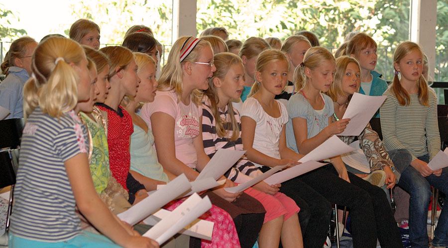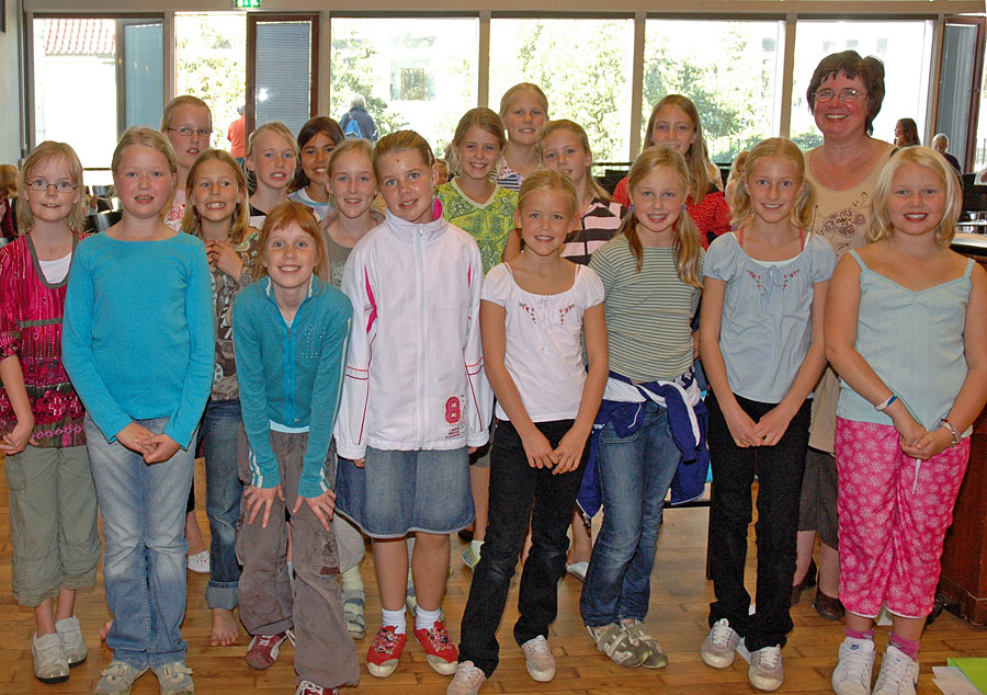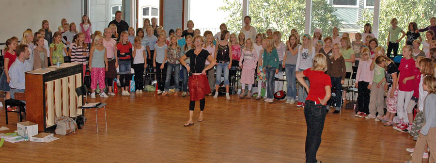 | Det tilbagevendende træf for kirkelige korskoler under Folkekirkens Ungdomskor (FUK) var denne gang henlagt til Århus. 150 piger - og et par enkelte drenge - fra kirkelige korskoler i Århus Stift havde lørdag den 23.9.2006 sat hinanden stævne i Katedralskolens festsal, hvor korleder Pia Boysen indøvede 15 forskellige sange, der sidst på eftermiddagen blev præsenteret ved en lille koncert i Århus Domkirke. Mårslet Kirkes Korskole var repræsenteret med 17 piger under ledelse af organist og korleder Pia Labohn. foto: © 2006 Jørgen Lauritsen