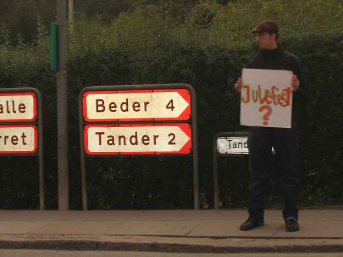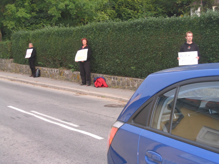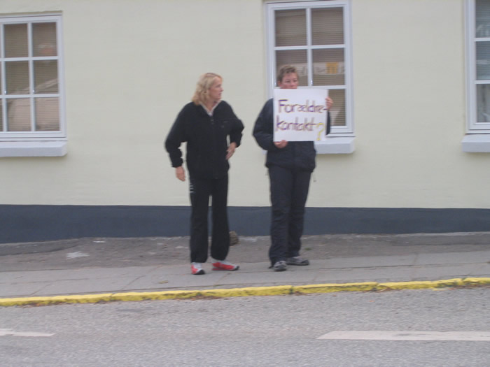 | En lang række pædagoger fra alle byens børneinstitutioner var i morges på gaden i Mårslet til en tavs demonstration. Med en række skilte med ord som "forældrekontakt", "nærvær", "festival" og "fattig barndom i et rigt land" fik de morgentravle forældre en påmindelse om, hvad pædagogerne ser af mulige konsekvenser af det nye spareforlig. foto: ©Birthe Jørgensen