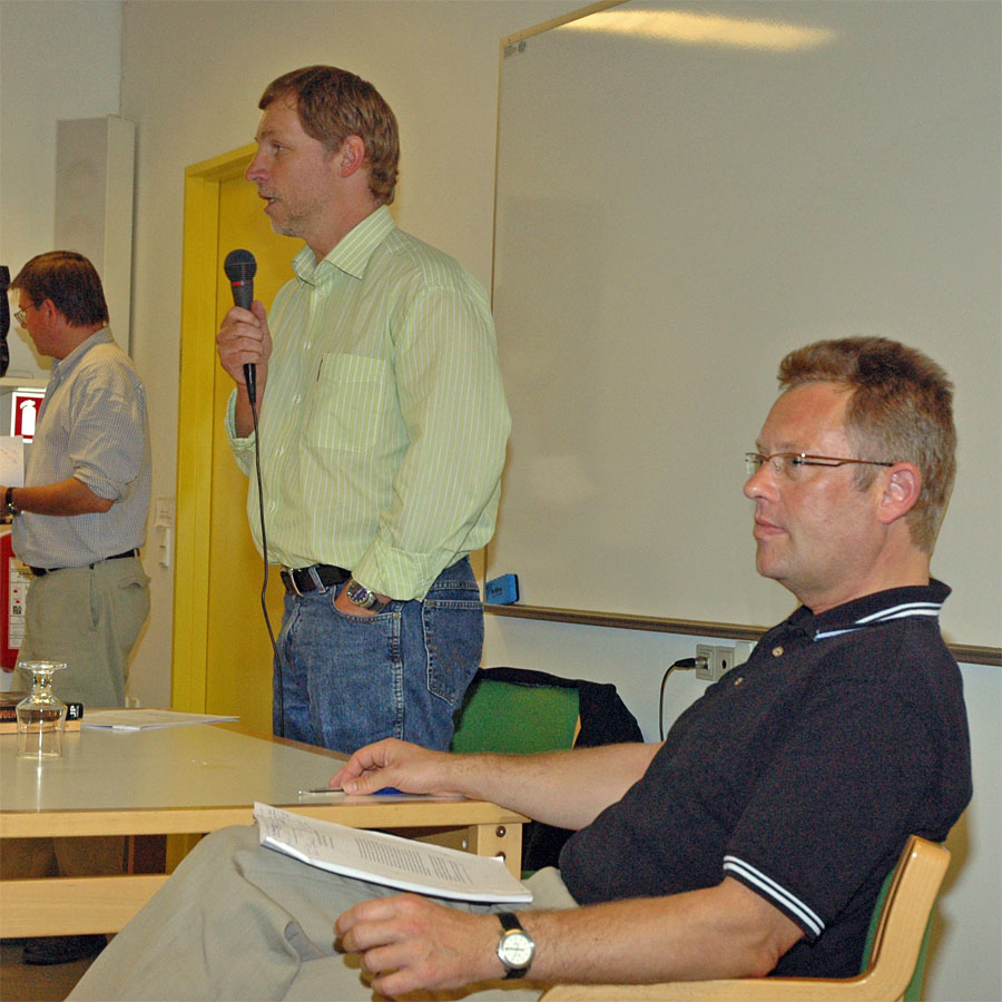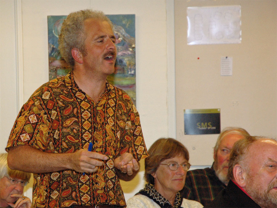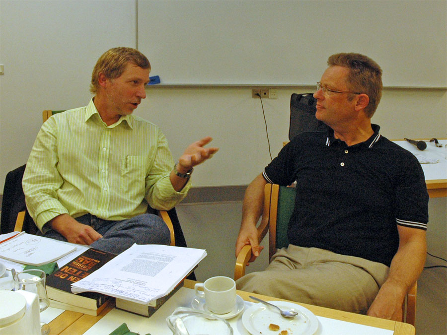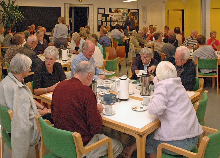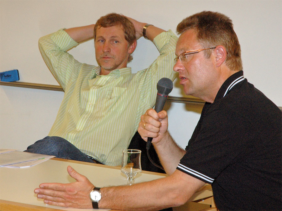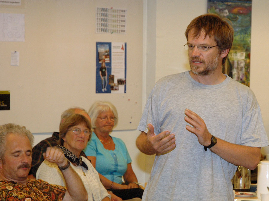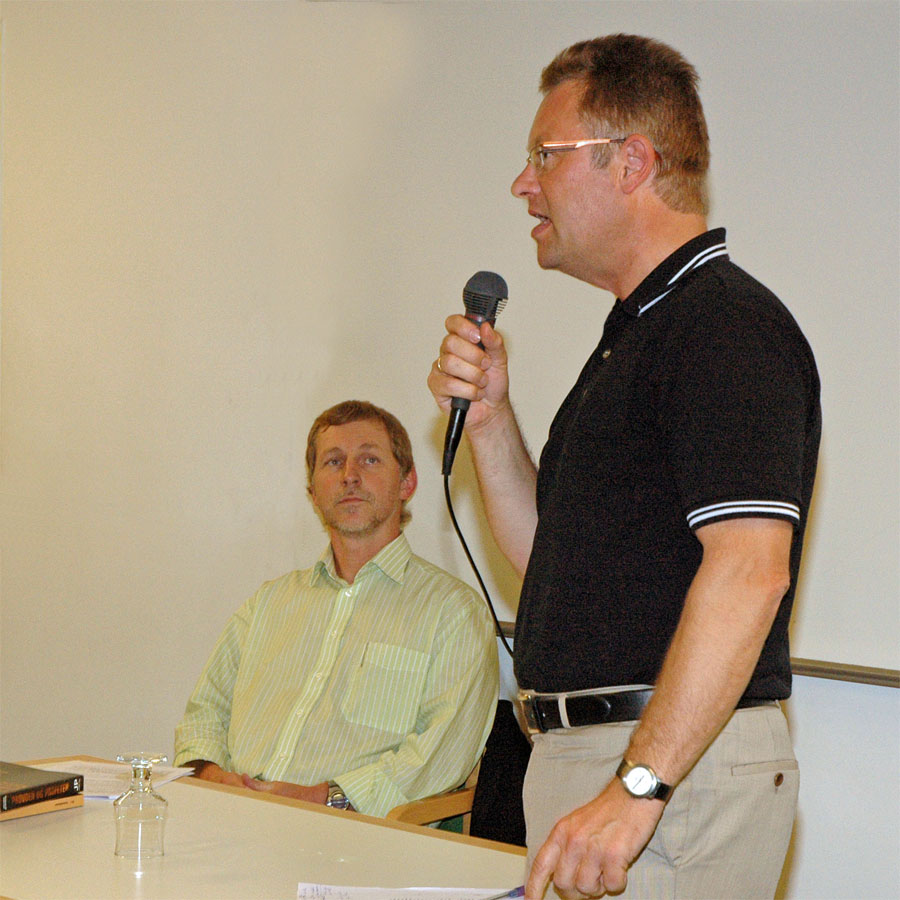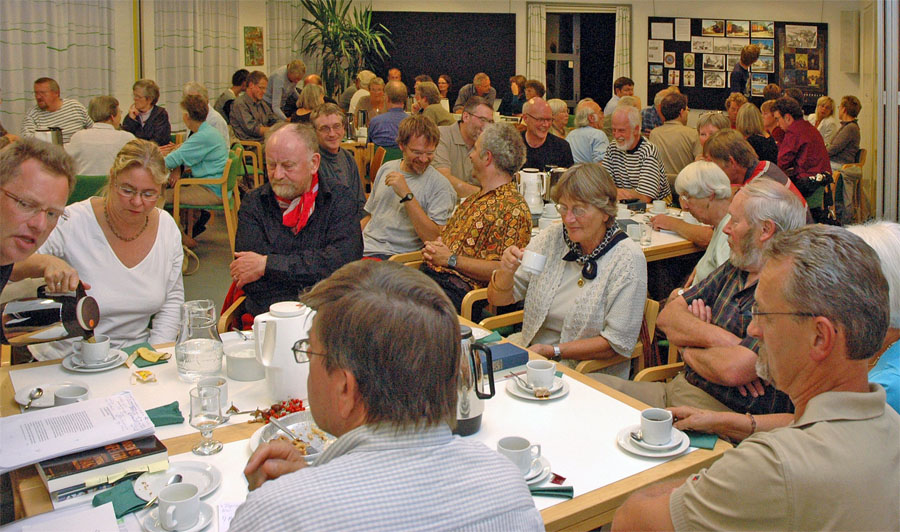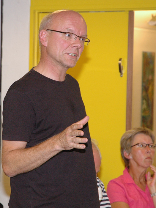 | Næsten på årsdagen for offentliggørelsen af Muhammedtegningerne i Jyllands Posten var der inviteret til debataften i Sognehuset, hvor en nuværende og en tidligere mårsletter ville forsvare hver deres synspunkt. Kim Hundevadt, journalist på JP, mener det var rigtigt at offentliggøre dem, mens Niels Henrik Gregersen, professor ved Københavns Universitet, er af den modsatte opfattelse og mener, Jyllands Posten skulle have været stillet for retten. Efter at hver i et ½ times indlæg havde givet udtryk for egne synspunkter, kom kaffen på bordet og ordet blev givet frit. Spørgelysten hos de omkring 80 tilhørere var stor. Enighed blev det ikke til, men mange aspekter blev draget frem, og vi gik allesammen nok en lille smule klogere hjem. Ordstyrer var lektor Ole Davidsen. foto: © 2006 Jørgen Lauritsen