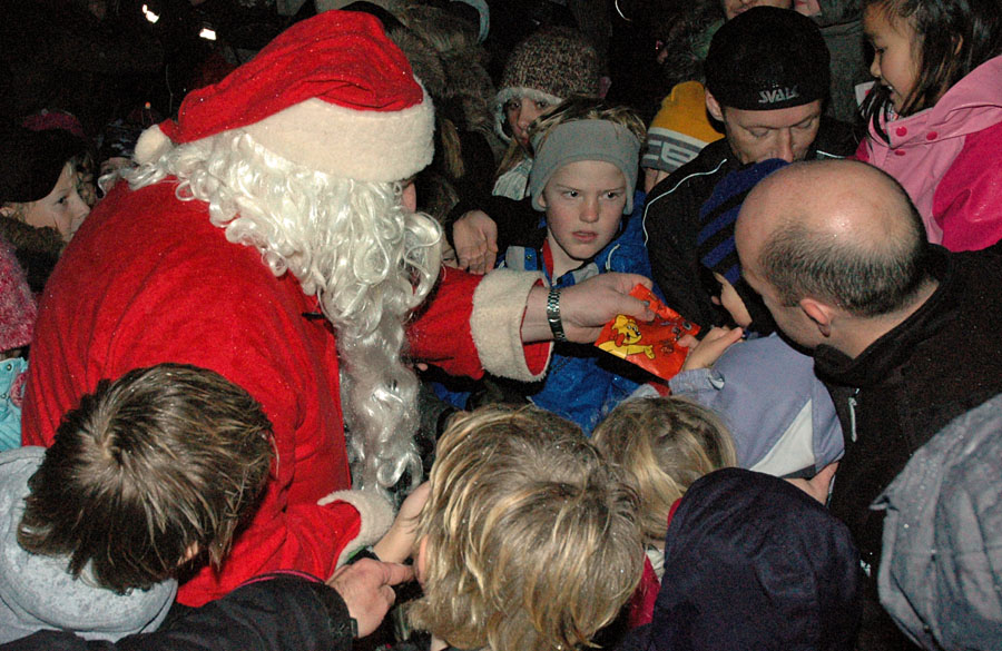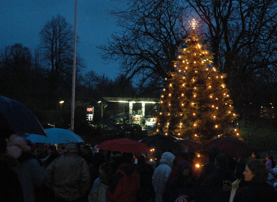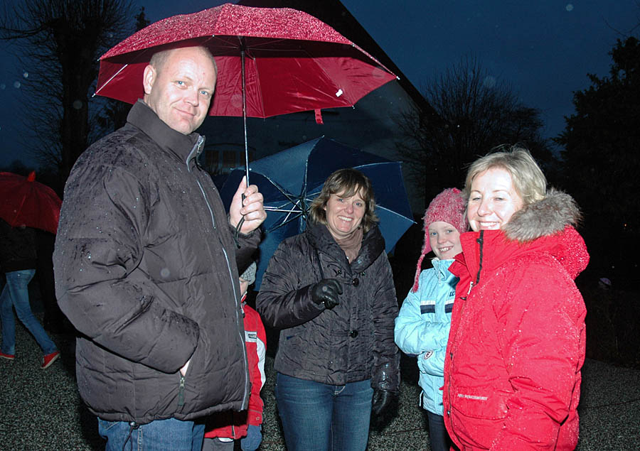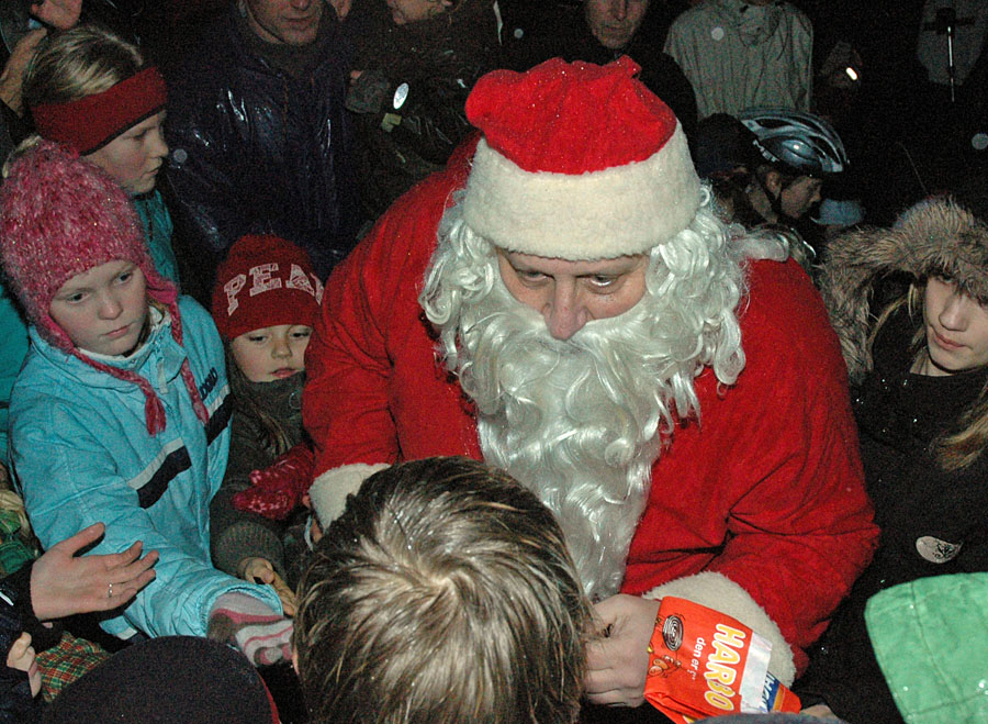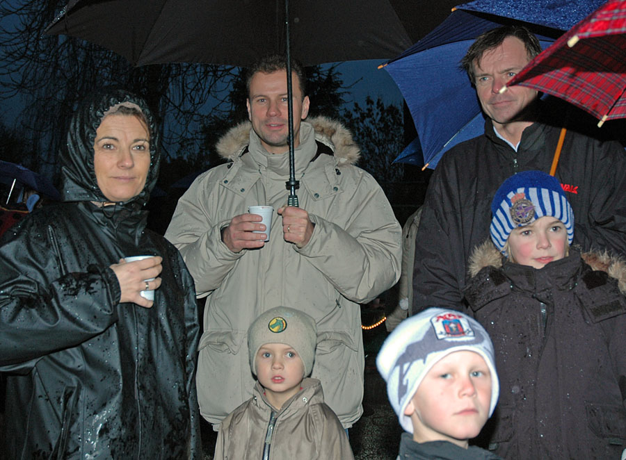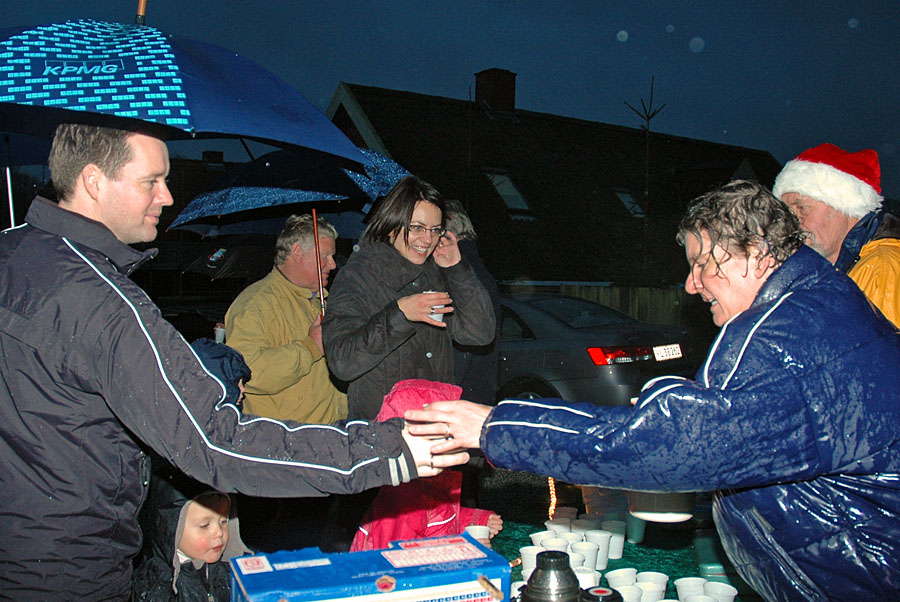 | Det regnfulde vejr tog ikke glæden fra de fremmødte, da Mårslets flotte juletræ blev tændt ved fire tiden lørdag den 2 december. Årets mårslettere Hanne Salling og Poul Erik tændte træet, medens de samme med masser af børn talte ned fra 10,- 9, - - - - - - - Julemanden kom i sin hjemmelavede Rickchaw, sammen med han trofaste hjælpere. De havde sækkene fulde af godteposer til byens mange børn. Nu stråler juletræet hver morgen fra kl 06 og til 9 og fra kl 15 til 01 om natten foto: © 2006 Jørgen Lauritsen