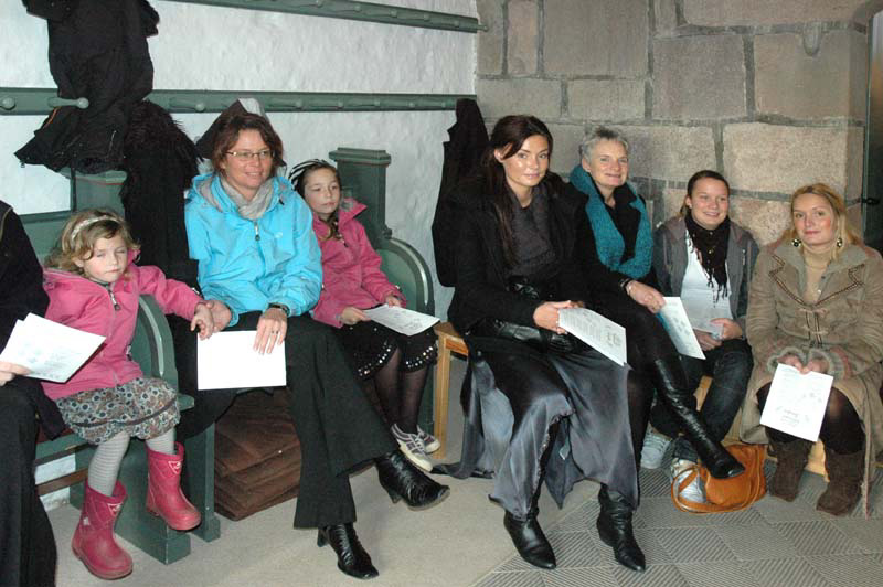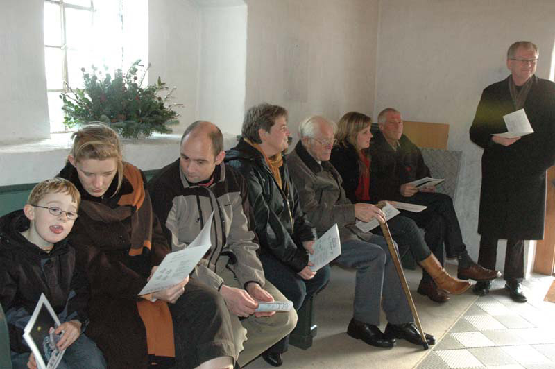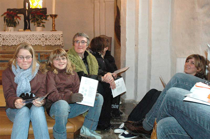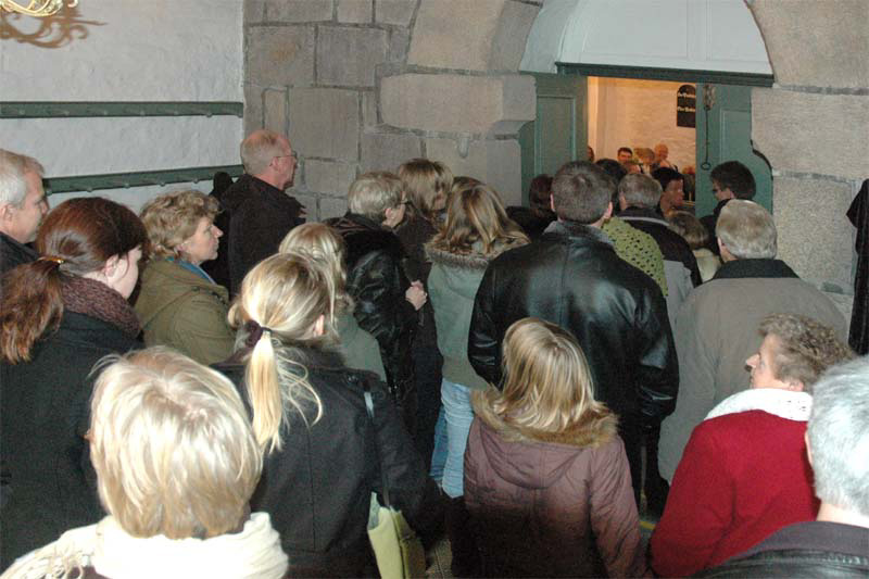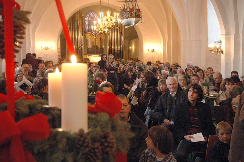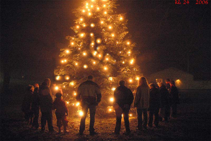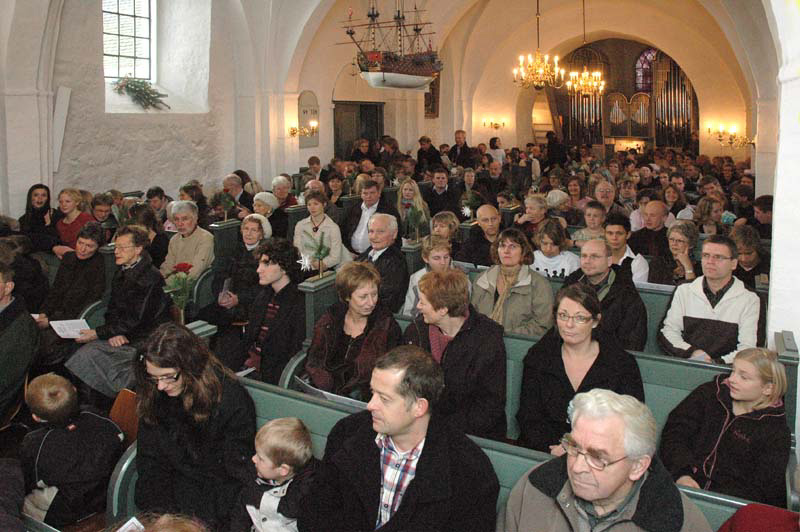 | Juleaften begyndte for mange med at gå i kirke, og selv om der juleaftensdag var hele tre gudstjenester, var der alligevel lang kø og trængsel foran - og i - Mårslet Kirke. På grund af sikkerhedshensynet var der desværre også mange, der ikke var kommet i rigtig god tid, som måtte gå forgæves. Og så ser det nu ud til, at det er blevet en fast tradition, at friske mårslettere samles juleaften kl. 24 til sang og dans omkring byens smukke juletræ (se nederst) foto: ©2006 Jørgen Lauritsen
