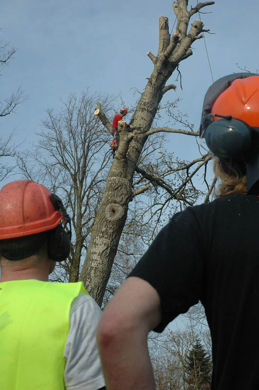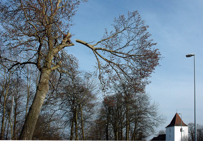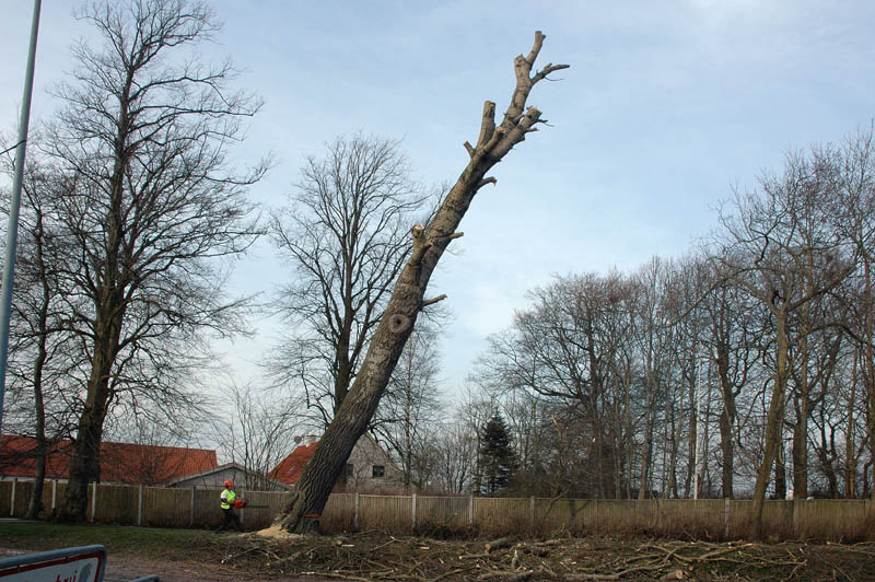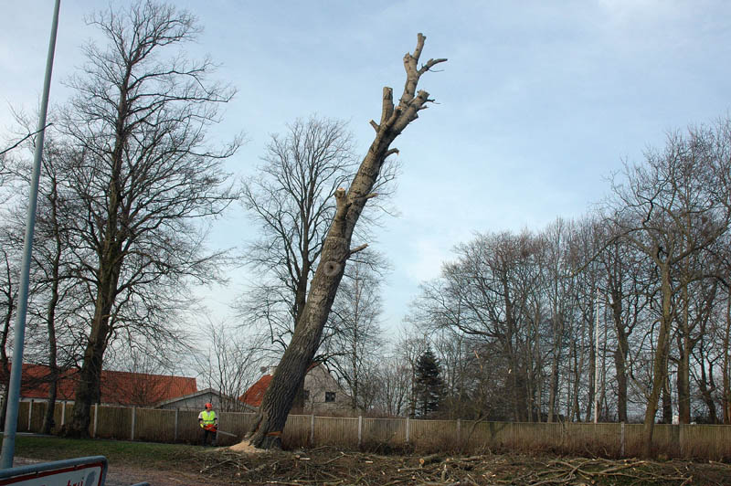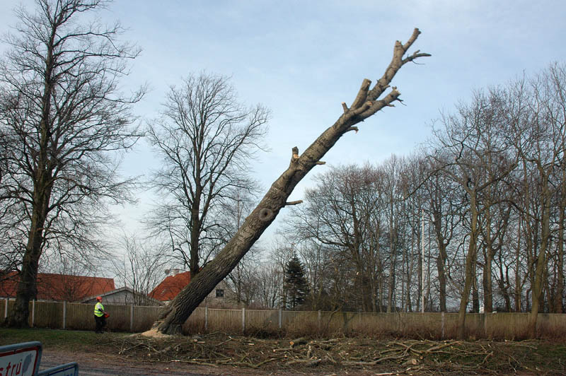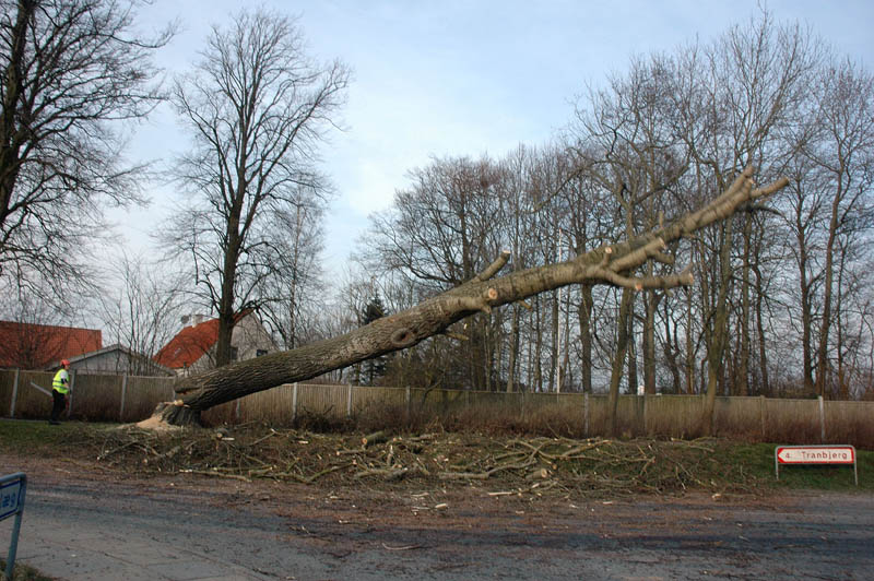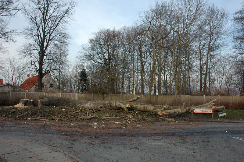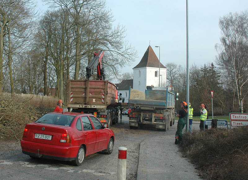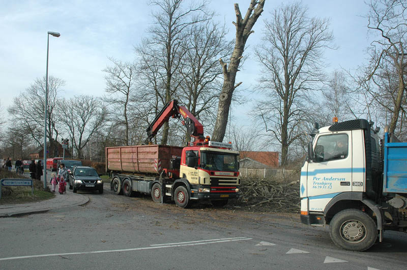 | Der var trafikkaos i Mårslet fredag den 23. marts om eftermiddagen. Årsagen var afspærring i forbindelse med fældningen af et af de store vejtræer overfor Testrupsvejs udmunding i Obstrupvej. Det var begyndt at hælde mere og mere og kunne være til fare for trafikanterne. Ved et møde på stedet mellem Niels Kaas fra firmaet Akroba i Silkeborg, poliassistent Preben Andersen fra Østjyllands Politi og Helle Holm Vinther og Preben Andersen fra Århus Kommune, blev det besluttet at fælde træet omgående. Tilskuerne blev vidne til et professionelt udført præcisionsarbejde af de tre træmænd Niels Kaas, Mikkel Duusgaard og Jukas Hamburger. Eneste skade var et lille ødelagt vejskilt. Niels Kaas talte årringene. Det blev til 80 og at det dermed var plantet omkring 1927. En del af stammen blev placeret på SFO's legeplads på modsatte side af vejen. foto: © 2007 Jørgen Lauritsen