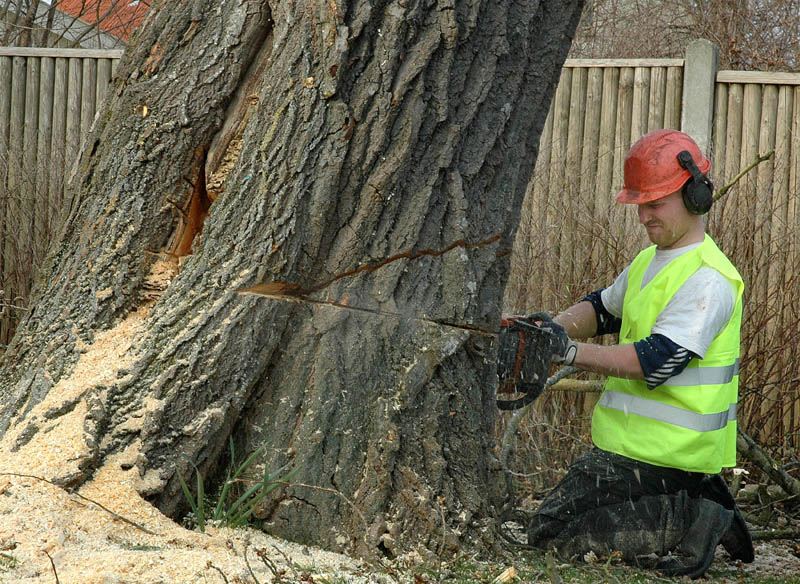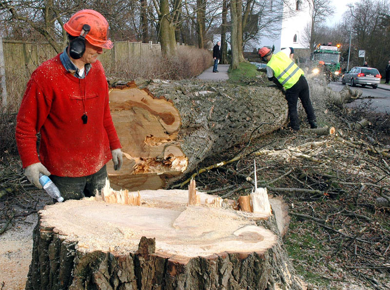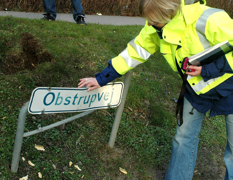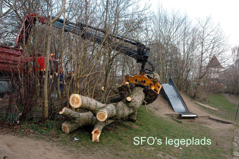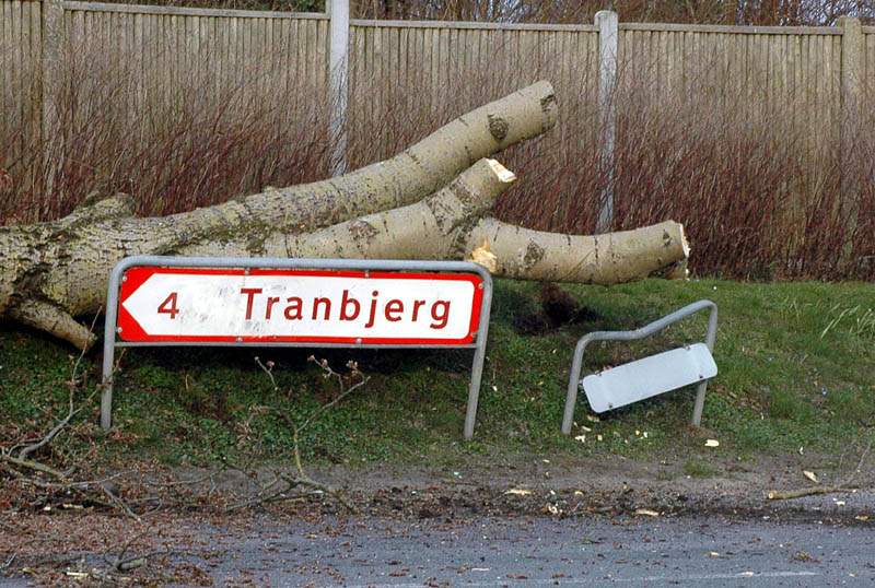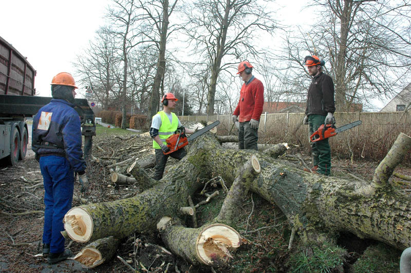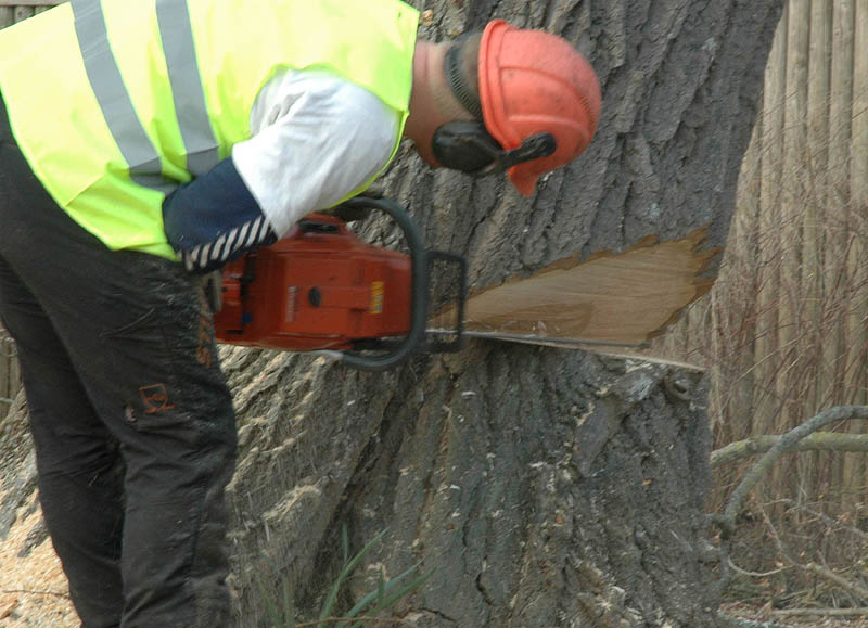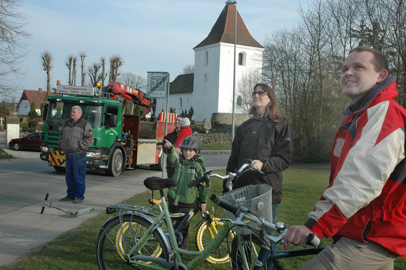 | Der var trafikkaos i Mårslet fredag den 23. marts om eftermiddagen. Årsagen var afspærring i forbindelse med fældningen af et af de store vejtræer overfor Testrupsvejs udmunding i Obstrupvej. Det var begyndt at hælde mere og mere og kunne være til fare for trafikanterne. Ved et møde på stedet mellem Niels Kaas fra firmaet Akroba i Silkeborg, poliassistent Preben Andersen fra Østjyllands Politi og Helle Holm Vinther og Preben Andersen fra Århus Kommune, blev det besluttet at fælde træet omgående. Tilskuerne blev vidne til et professionelt udført præcisionsarbejde af de tre træmænd Niels Kaas, Mikkel Duusgaard og Jukas Hamburger. Eneste skade var et lille ødelagt vejskilt. Niels Kaas talte årringene. Det blev til 80 og at det dermed var plantet omkring 1927. En del af stammen blev placeret på SFO's legeplads på modsatte side af vejen. foto: © 2007 Jørgen Lauritsen