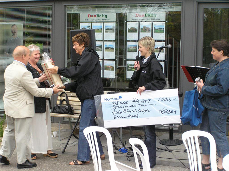 | Årets Mårslet-Borger Kl. 11 blev årets Mårslet-Borger kåret ved det traditionelle arrangement på Butikstorvet i byens midte. Ellen Albæk fik æren og den tilhørende Nordeapris for sit mangeårige arbejde indenfor spejderbevægelsen, og specielt for sin indsats som leder for de mindste drenge - Bæverne. Årets Mårslet-Borger har i særlig grad gjort sig gældende med en aktiv, ulønnet indsats for byen, for en forening, klub eller andet til glæde for børn, unge eller ældre. Udvælgelsen blandt de indstillede foretages af en komité med de seneste to prismodtagere samt lederen af Nordea i Mårslet. I år består komitéen således af Hanne Torp Jensen (prismodtager i 2005), Hanne og Poul Erik Jensen (prismodtagere i 2006) samt Vibeke Rosendahl fra Nordea. foto: ©2007 Jesper Andersen