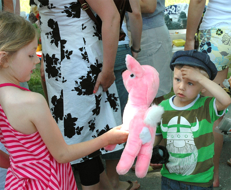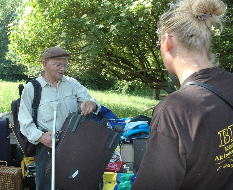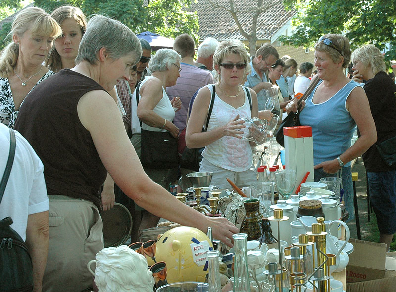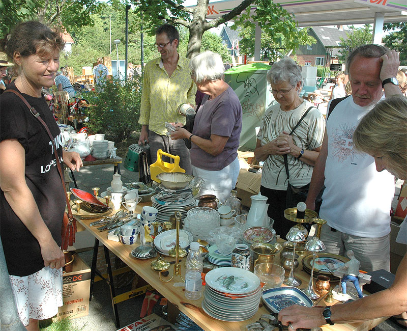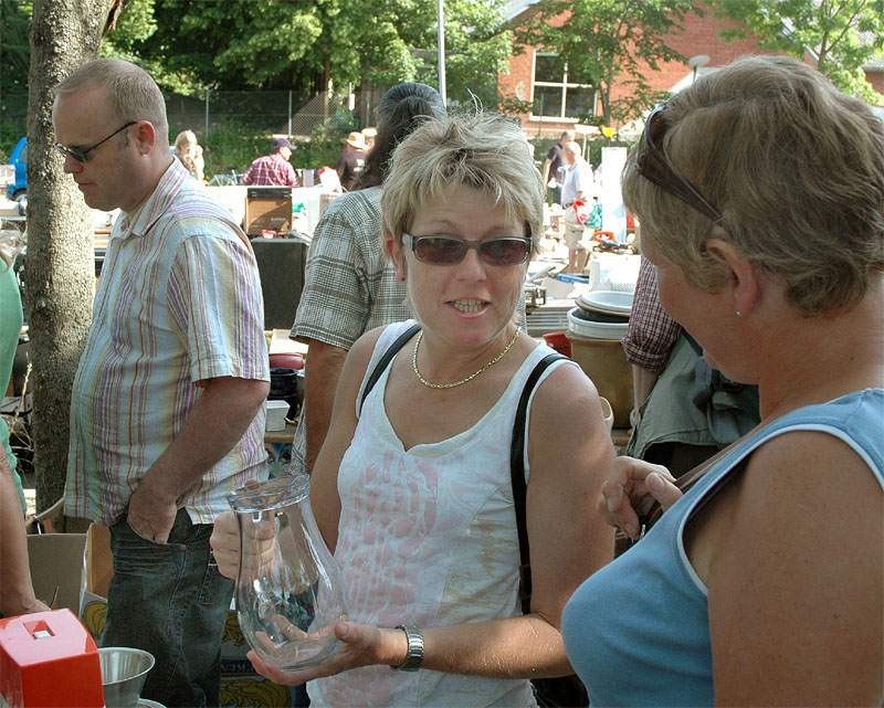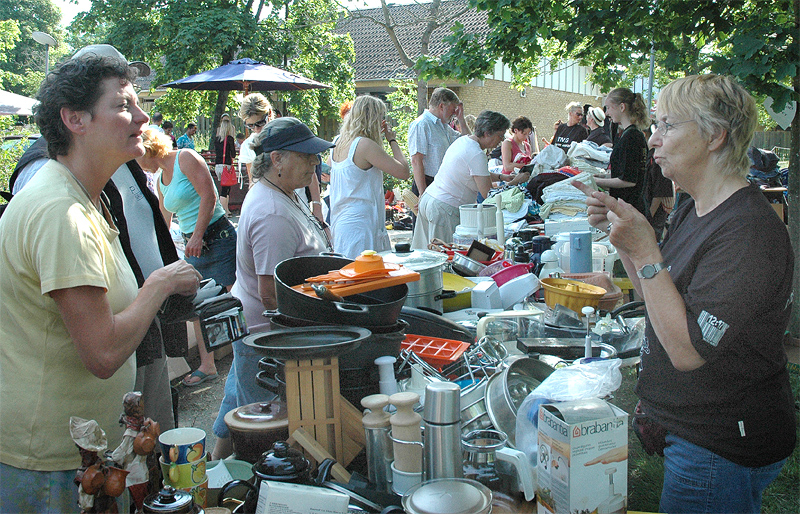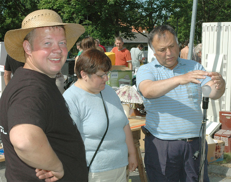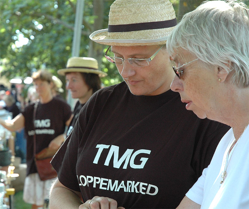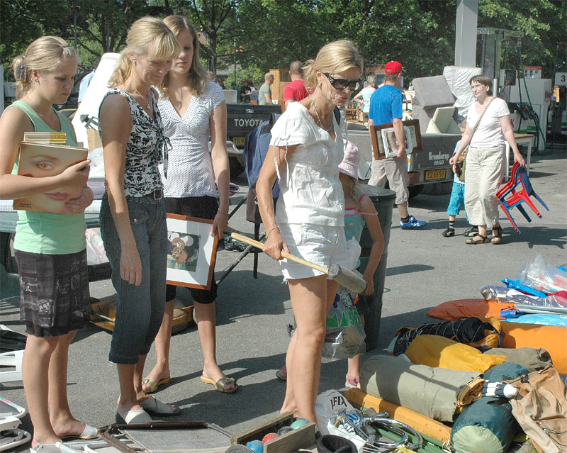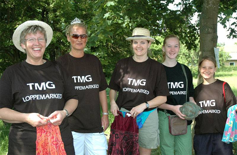| Der var ikke rigtig mulighed for at få benzin til andet end græsslåmaskinen, men så var der til gengæld mulighed for at gøre en god handel, gætte på grisens vægt eller bare nyde denne særlige stemning, når TMG holder sit årlige loppemarked ved OK-tanken. Helt fra morgenstunden var markedet godt besøgt, det fantastiske sommervejr havde sikkert lokket mange, både børn og voksne til. Og der var mange muligheder for at finde noget nyt legetøj, et extra TV, eller den kommode man altid har manglet. Grisen gik og hyggede sig uden at bekymre sig om sin skæbne, mens folket gættede kilo og gram. Der var syv, der havde gættet grisens vægt rigtigt, 89 kg, og efter en lodtrækning - med Emilie fra 2.b som Lykkens Gudinde - blev det familien Albertsen, Visbjerg Hegn, der løb med den. De er dygtige (eller heldige) i den familie, for det er anden gang de vinder! - De samlede gætterier gav et resultat på 3.700 kr. Det var de omkring 50 frivillige indsamlere og sælgere, der totalt sørgede for en rekordomsætning på ca. 77.000 kr. Nettoresultatet lå på godt 50.000 kr. foto: © 2007 Jørgen Lauritsen
