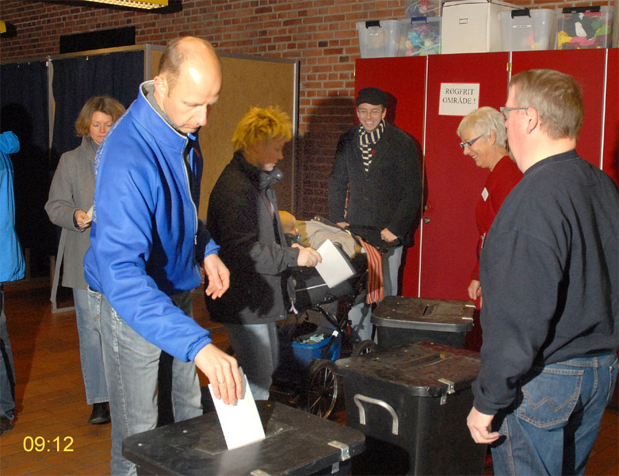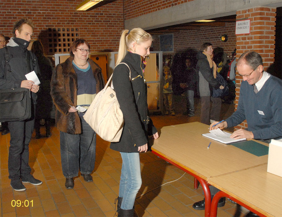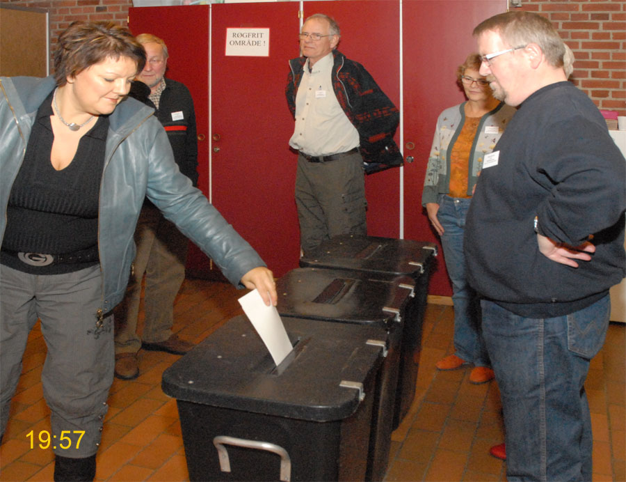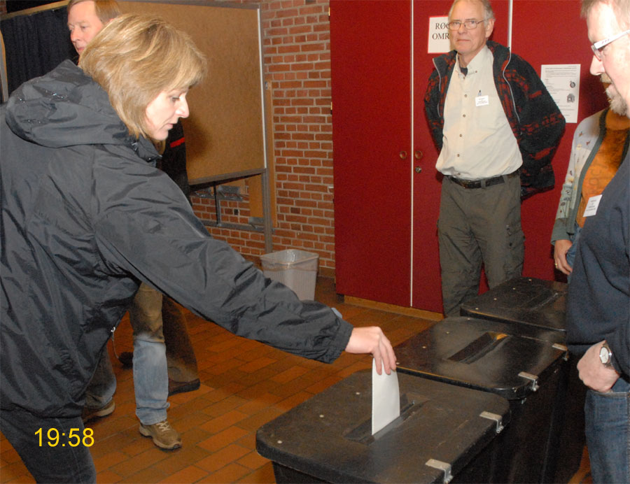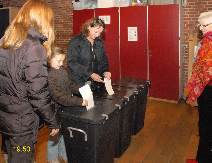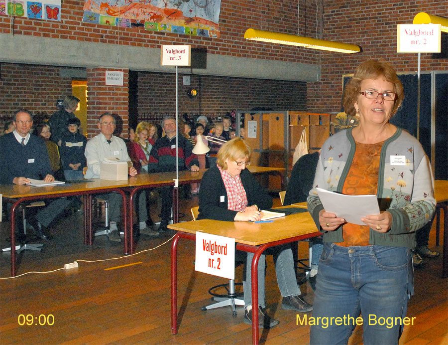 | Margrethe Bogner åbnede valghandlingen kl. 9 på Mårslet Skole til folketingsvalget 13. nov.2007. Den første der satte sit kryds var Pernille, og det var også første gang, hun kunne afgive sin stemme. Mårslet er kendt for en høj stemmeprocent ved folketingsvalg, denne gang kom den helt op på 93,9, hvilket er rekord i Mårslet. Valghandlingen blev behørigt - og på reglementeret vis - afsluttet kl. 20 af Margrethe Bogner. foto: ©2007 Jørgen Lauritsen
