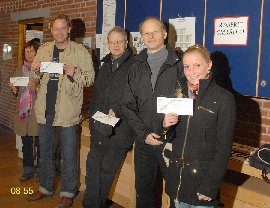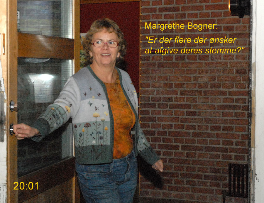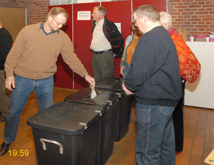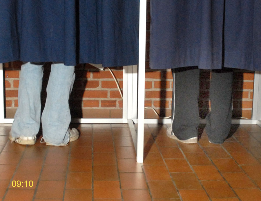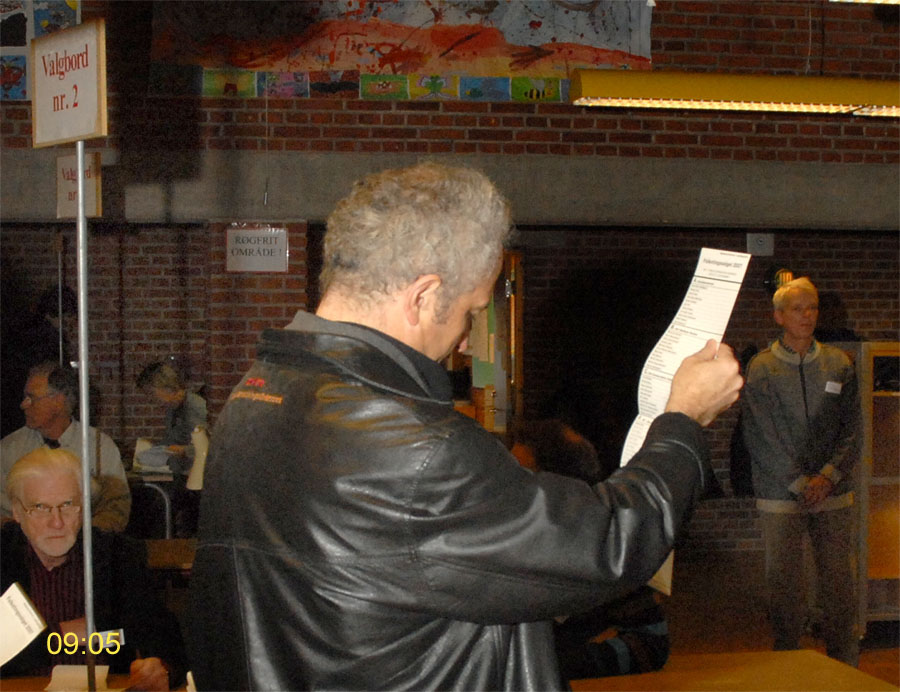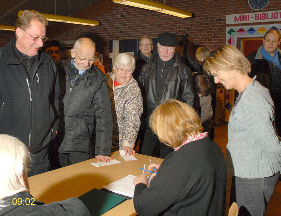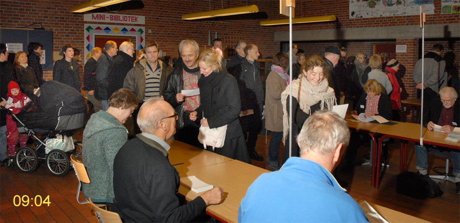 | Margrethe Bogner åbnede valghandlingen kl. 9 på Mårslet Skole til folketingsvalget 13. nov.2007. Den første der satte sit kryds var Pernille, og det var også første gang, hun kunne afgive sin stemme. Mårslet er kendt for en høj stemmeprocent ved folketingsvalg, denne gang kom den helt op på 93,9, hvilket er rekord i Mårslet. Valghandlingen blev behørigt - og på reglementeret vis - afsluttet kl. 20 af Margrethe Bogner. foto: ©2007 Jørgen Lauritsen