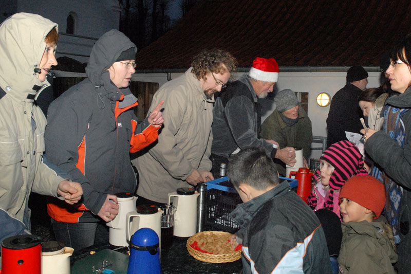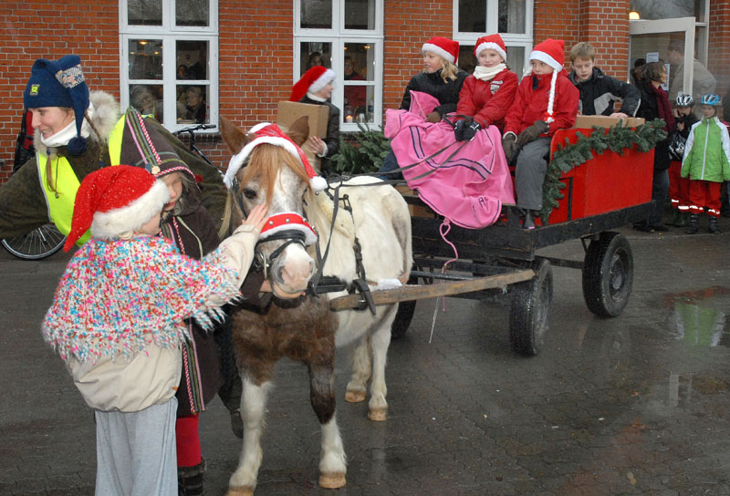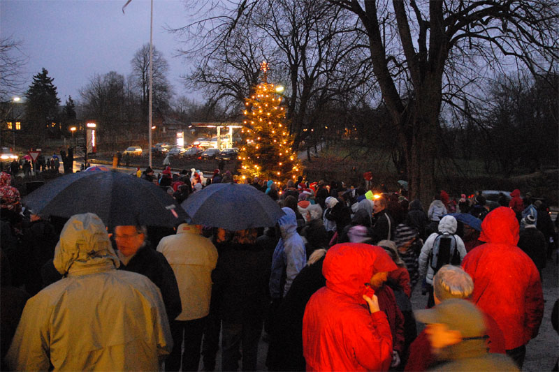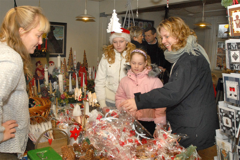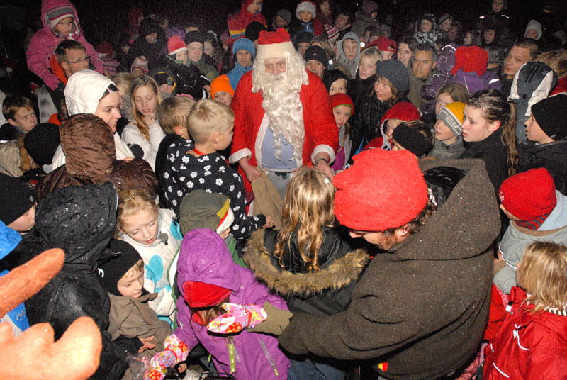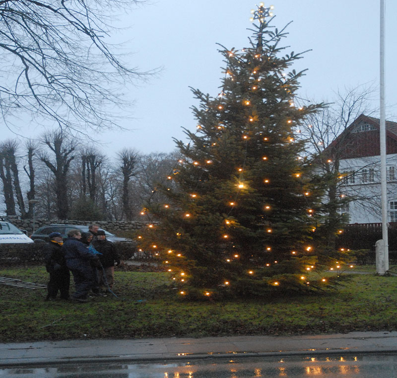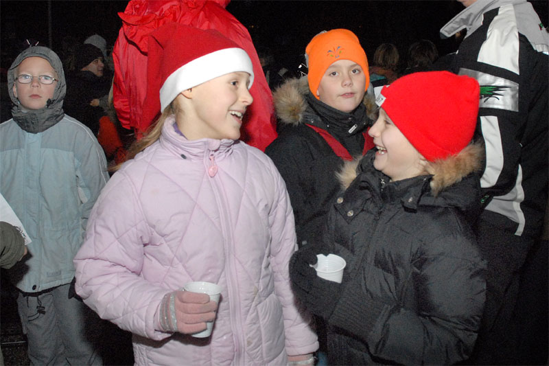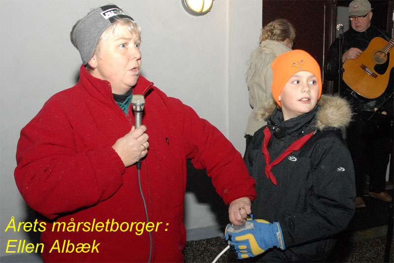 | Om morgenen mødtes en lille gruppe fra Mårslet Juletræslaug for at sætte lys på byens juletræ. I Julestuen i Borgerhuset kunne der lørdag og søndag fra kl. 10 - 17 erhverves fantasifulde såvel som traditionelle juledekorationer og julepynt, godteposer, slik, julekort og meget andet, som hører julen til. Kl. 14 ankom Mårslets Julebryg i hestevogn, og to timer senere samledes man på pladsen foran kirken, hvor årets mårsletborger, Ellen Albæk, tændte juletræet. Der var fællessang akkompagneret af Ole Nørskov, og Julemanden ankom med godteposer til børnene. foto: ©2007 Jørgen Lauritsen