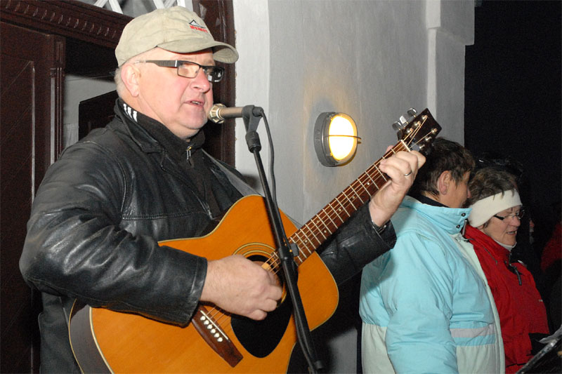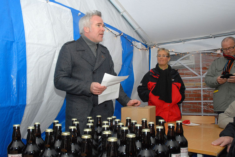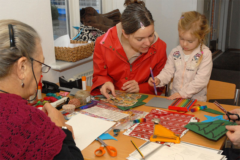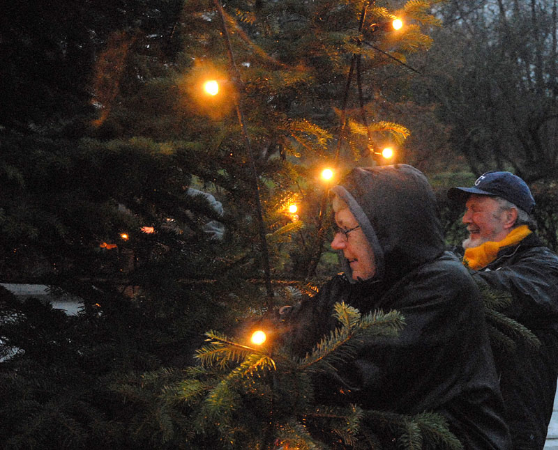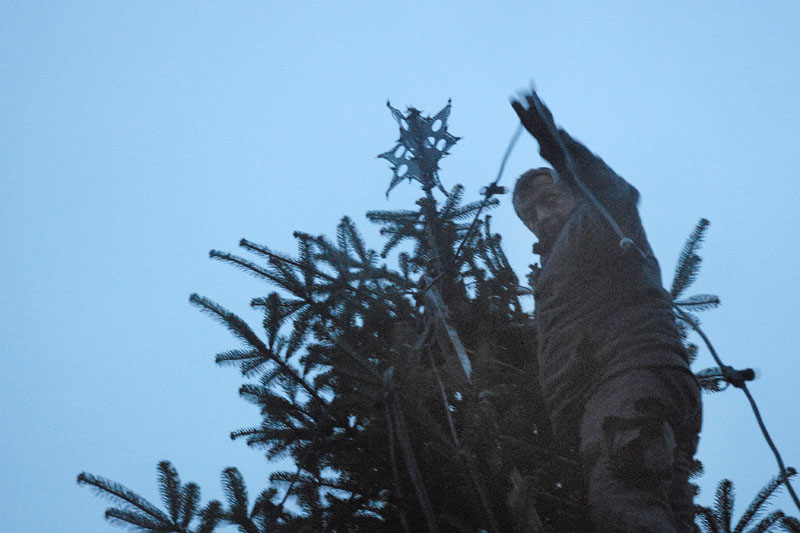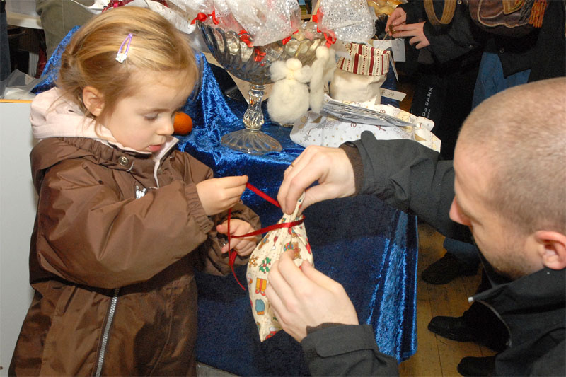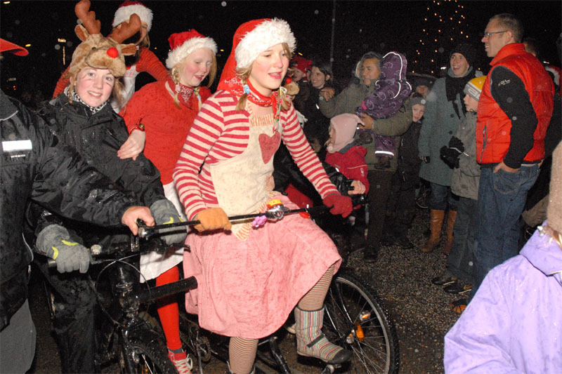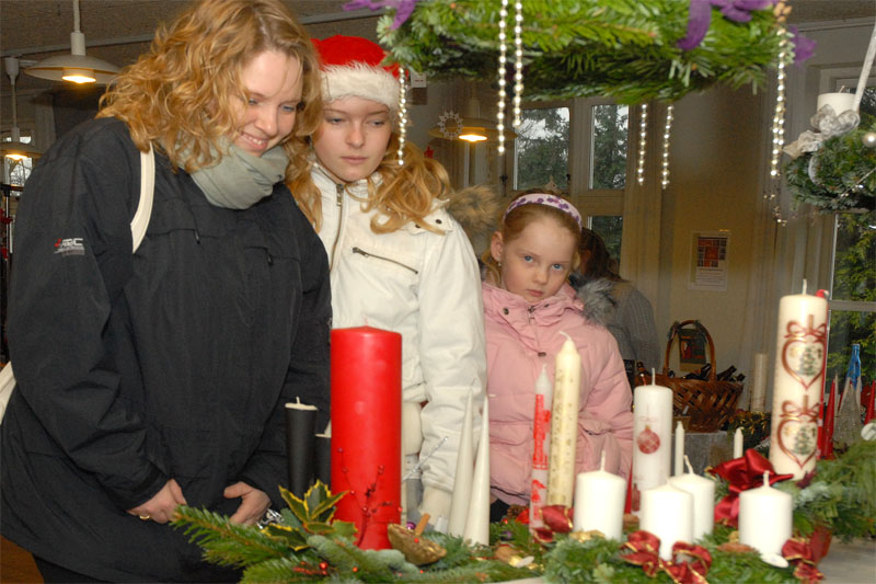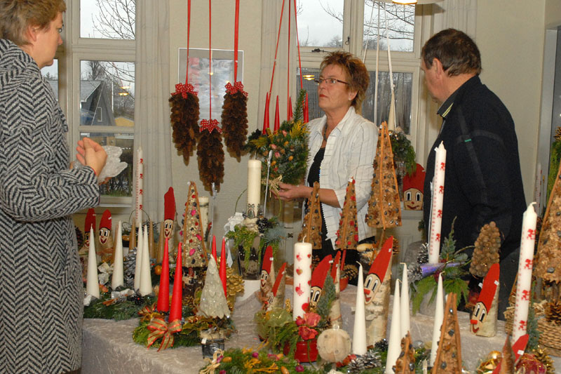 | Om morgenen mødtes en lille gruppe fra Mårslet Juletræslaug for at sætte lys på byens juletræ. I Julestuen i Borgerhuset kunne der lørdag og søndag fra kl. 10 - 17 erhverves fantasifulde såvel som traditionelle juledekorationer og julepynt, godteposer, slik, julekort og meget andet, som hører julen til. Kl. 14 ankom Mårslets Julebryg i hestevogn, og to timer senere samledes man på pladsen foran kirken, hvor årets mårsletborger, Ellen Albæk, tændte juletræet. Der var fællessang akkompagneret af Ole Nørskov, og Julemanden ankom med godteposer til børnene. foto: ©2007 Jørgen Lauritsen