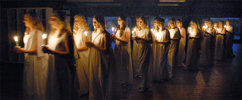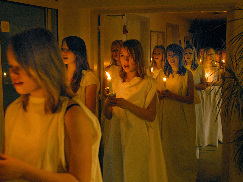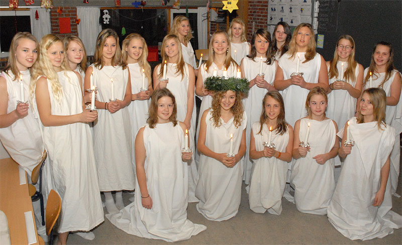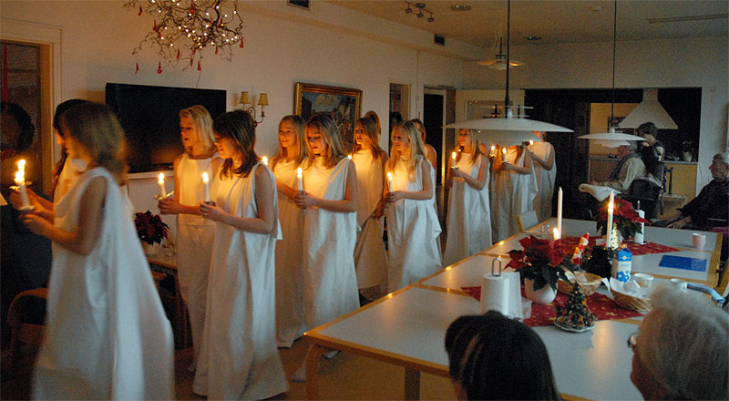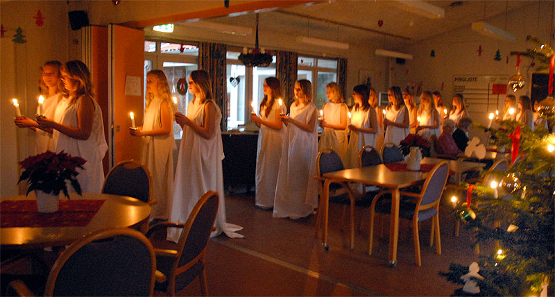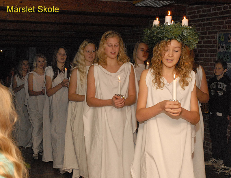 | Den 13. december er lysets dag og dermed dagen for de traditionelle luciaoptog. Kl. 8 gik piger fra 7. klasserne på Mårslet Skole højtideligt rundt på gangene syngende "Santa Lucia", og en time senere gentog pigerne optoget for de ældre på lokalcenter Kildevang. foto: ©2007 Jørgen Lauritsen