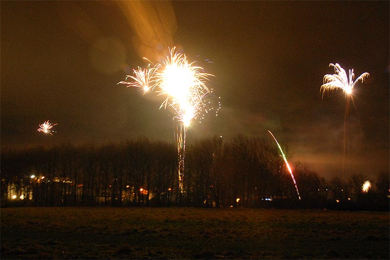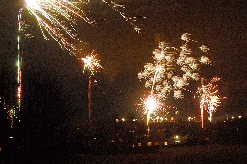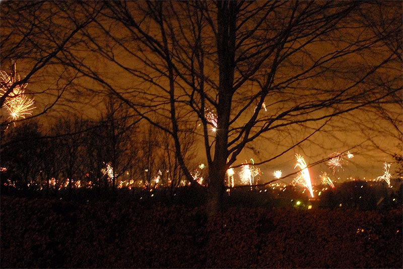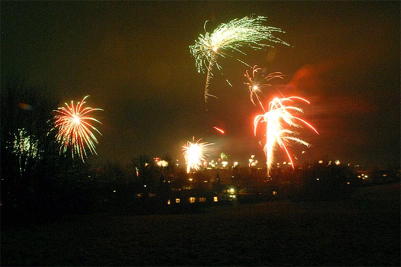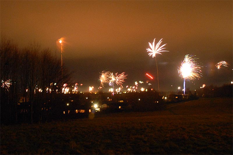 | Nytårsaften 2007-08 var ideelt vejr til nytårsskyderi. Og vi kom ind i det nye år med et mageløst raketgalleri på himlen over Mårslet, som vist ikke har set sin lige i tidligere år. Scenerierne er udsigten over Mårslet lige efter årsskiftet - mod syd og nord - fra Byparken ved "Den store sten". foto: ©2008 Jørgen Lauritsen