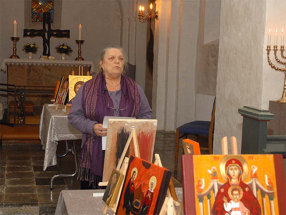 | Fredag aften den 7. marts fremviste Else Marie Hulemose sine ikoner i Mårslet Kirke som optakt til menighedsrådets arrangement Påske - Kunst og Ikoner. Efterfølgende var der dækket op til påskemåltid i Sognehuset, kreeret af Margit Jacobsen. Der var underholdning af Hanne og Ole Davidsen og énmandsjazzorkestret Jørgen Kraglund på klarinet. foto: ©2008 Jørgen Lauritsen