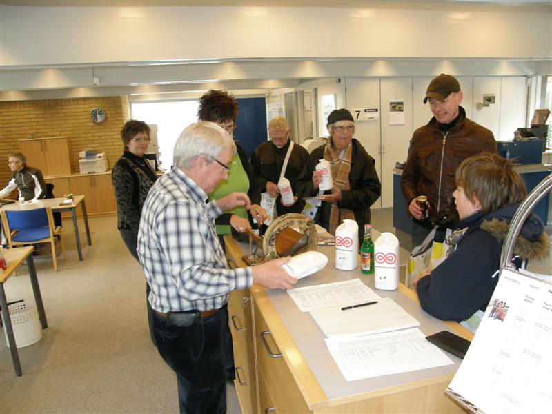 | Til en afveksling blev udbyttet i dag AFLEVERET i banken. Det handlede nemlig ikke om et røveri, men om penge fra søndagens indsamling for "Kræftens Bekæmpelse" Søndag kl. 10 mødte 30 indsamlere op i Nordea til kaffe og rundstykker. Efter en kort orientering gik indsamlerne ud i den dejlige forårsdag. Alle kom glade tilbage, de var blevet godt modtaget, selvom mange ikke var hjemme. Mens Conny, Erik Og Poul talte bøtterne op, ventede indsamlerne spændt på resultatet. Resultatet blev også over al forventning kr. 39.473,50 en forøgelse i forhold til sidste års resultat på kr. 5.000,-. foto: ©2008 Jesper Andersen