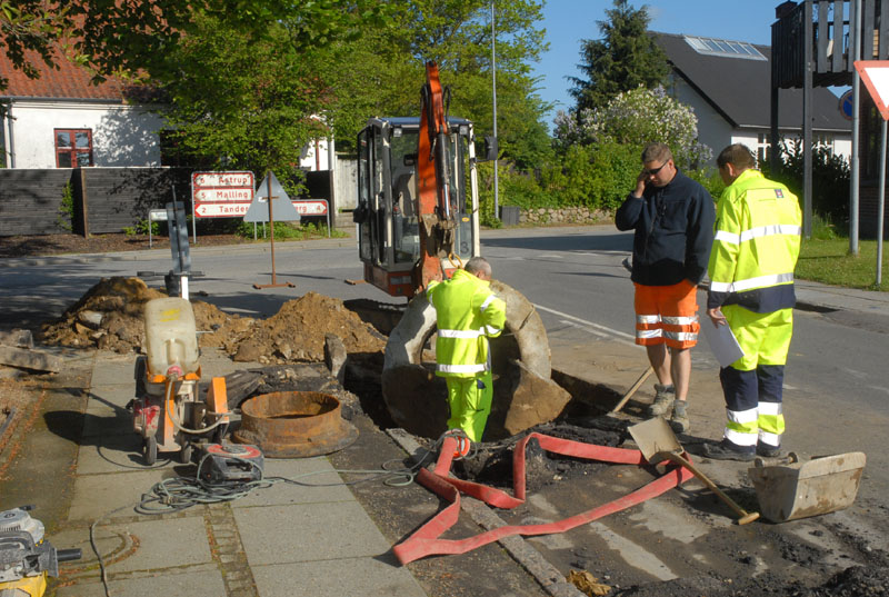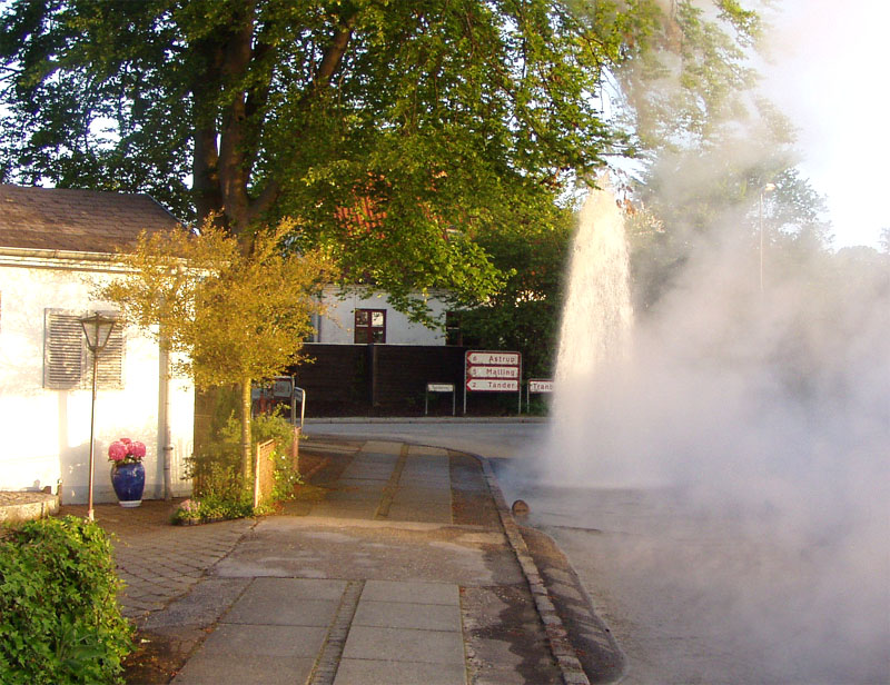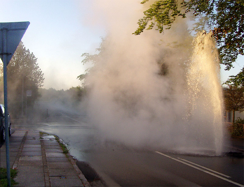 | Det var som en geyser, der i de tidlige morgentimer ved 5:30-tiden den 20. maj sprang direkte op gennem asfalten ved Bedervejs udmunding i Tandervej. En defekt ventil udløste en 5 meter høj, kogende vandsøjle, der gav de lysegrønne bøgeblade ovenover efterårsfarve og indhyllede omgivelserne i tæt tåge. Heldigvis kom ingen noget til. Teknikerne var hurtigt til stede og fik lukket for hanen. Så der var denne morgen kun koldt vand i hanerne til Bedervej, Gl. Bedervej og Gyldenkronesvej. Ved middagstid var fejlen udbedret, og nu mangler kun asfaltarbejdet. foto: ©2008 Hugo Kristensen og Jørgen Lauritsen