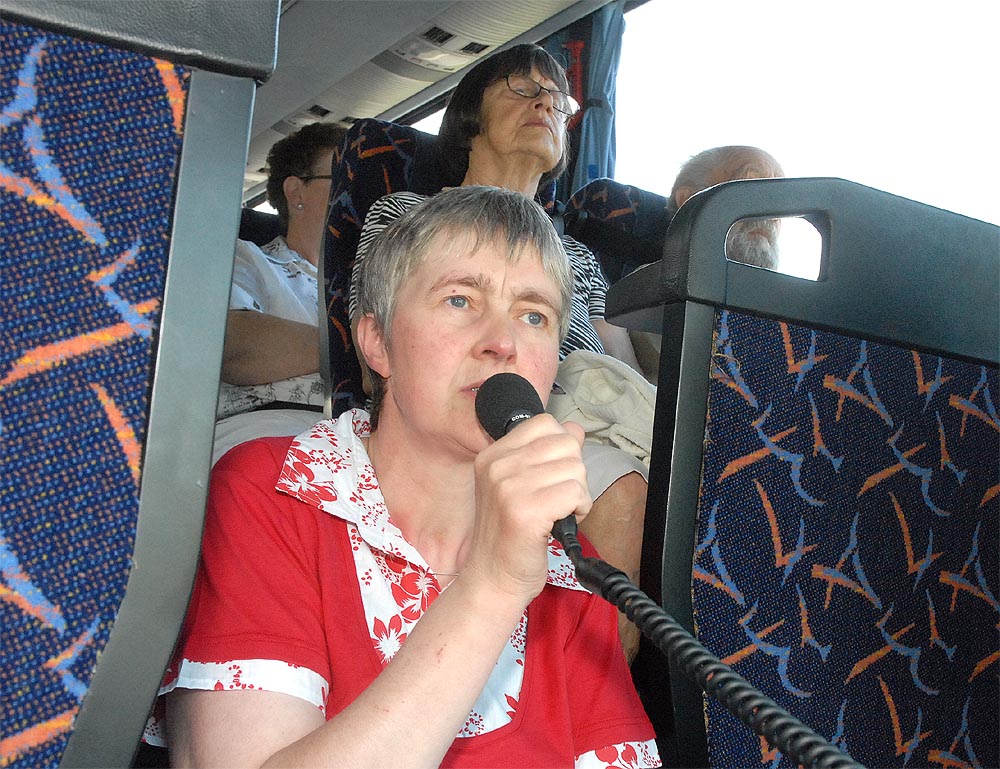 Hyggeklubbens formand, Else Svendsen, som guide undervejs. På sædet bag Else ses Tove Frost.