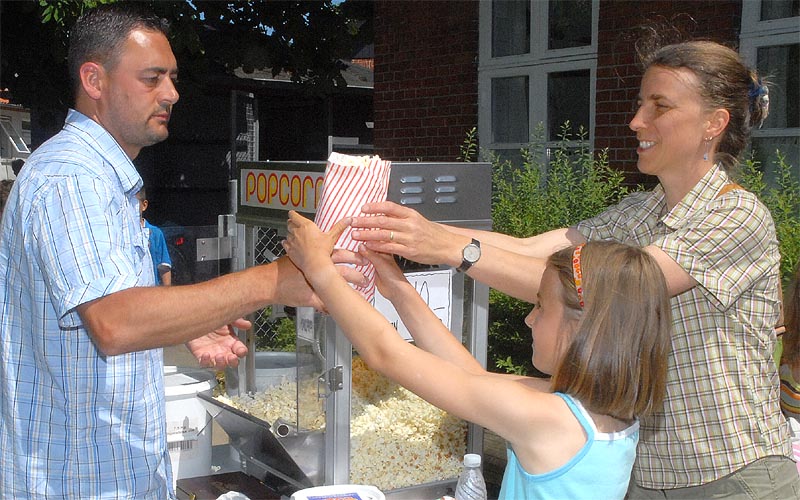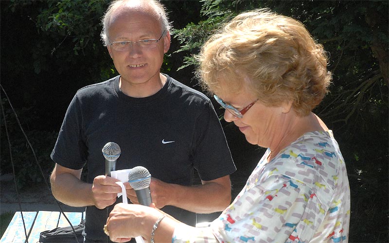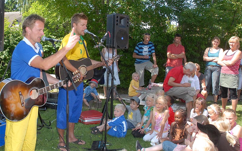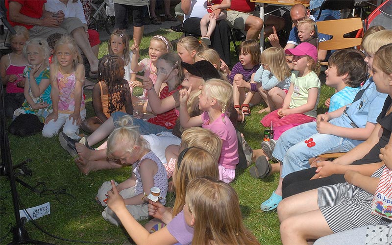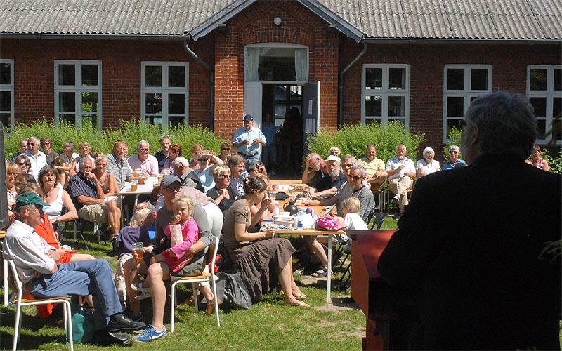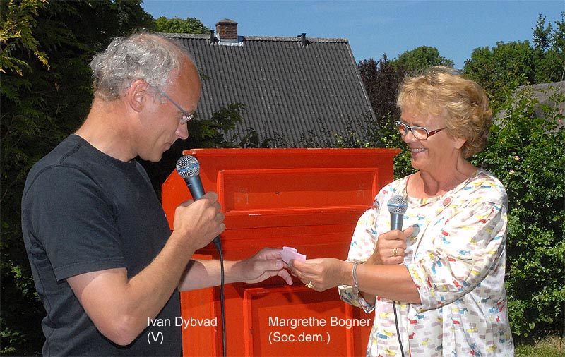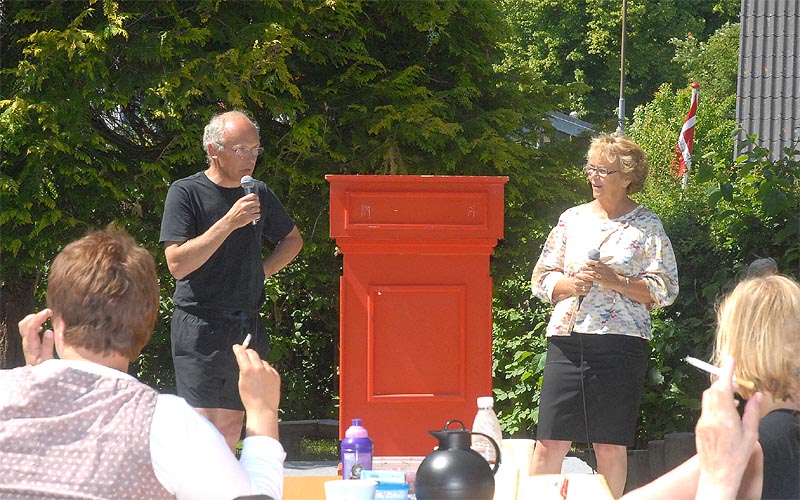 | Grundlovsdagen blev fejret på traditionel vis i Borgerhusets have. Margrethe Bogner og Ivan Dybvad duellerede på lokalpolitiske emner, og forstander på Testrup Højskole, Jørgen Carlsen, holdt grundlovstalen, hvor han til sidst ønskede tillykke med Grundlovens 159 års fødselsdag. Dagen sluttede med underholdning af Kolling og Lillebror. Læs udførligt referat under "Nyheder". Og Mårsletterne kan så fortsætte med at sige tillykke til den nye bager, Ronnie Nielsen, der åbnede den 5. juni kl. 12 med bl.a. gratis is til børnene. SE de nederste 4 billeder.