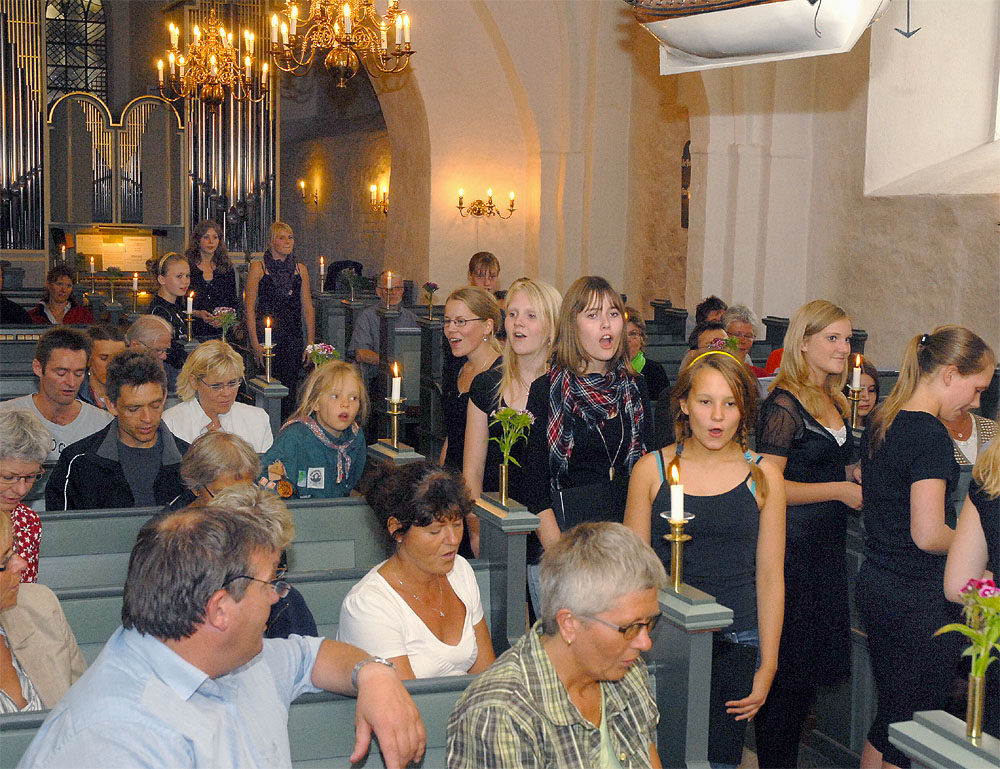 | Det var et festligt repertiore Mårslet Kirkes Kor diverterede med ved afslutningskoncerten i Mårslet Kirke onsdag aften den 18. juni. Efter en fællessalme Nu blomstertiden kommer sprudlede koret med iørefaldende kompositioner. Og tilhørerne slap ikke for at være med i løjerne. I en fælleskanon over temaet fra DRs gamle pausesignal Drømte mig en Drøm i Nat blev vi hjulpet godt på vej af pigerne Og jubelen ville ingen ende tage, da koret sluttede med et fyrværkeri af en en negro spiritual, This Little Light, som vi endda fik to gange. Efter fællessalmen Du som har tændt millioner af stjerner sluttede aftenen med en lille forfriskning i våbenhuset. Programmet var sammensat af Pia Labohn og koret blev akkompagneret af Jan Ole Christiansen på klaver.