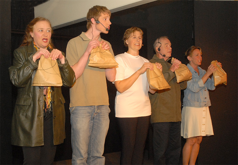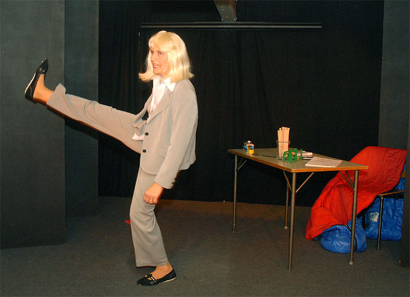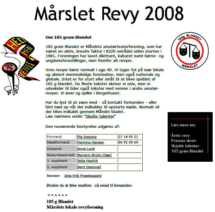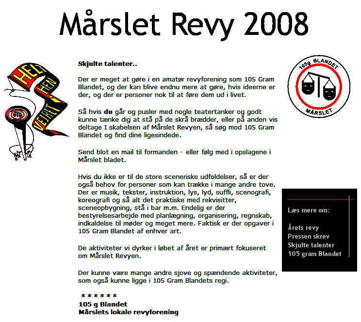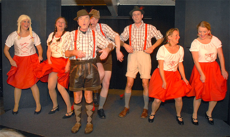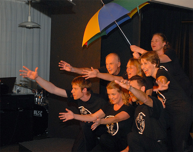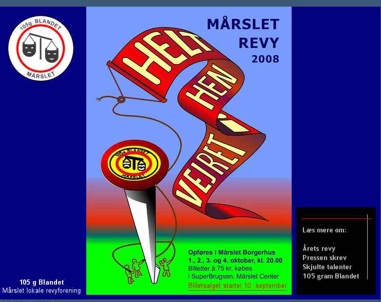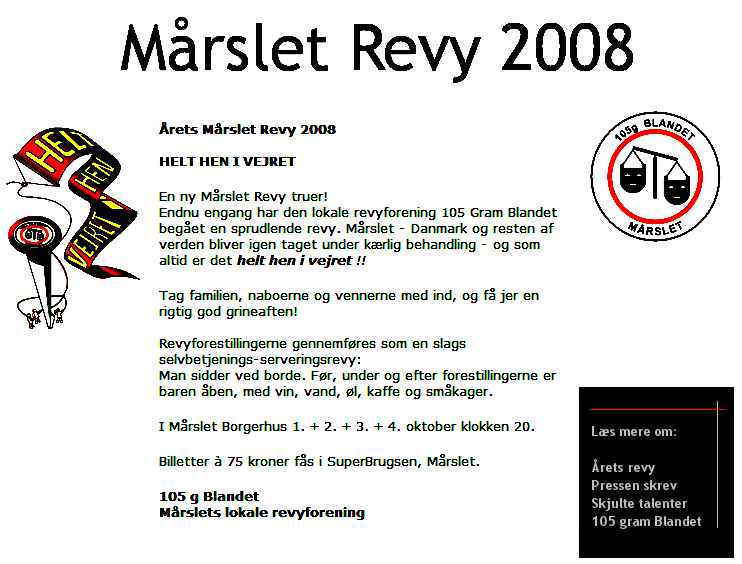| I aften og de næste tre aftener kører årets mårsletrevy "Helt hen i vejret"... over de skrå brædder for fuldt udsolgte huse i Borgerhuset. Det er en forrygende cocktail af sprudlende og morsomme indslag med en fin fornemmelse for det aktuelle, både lokalt og på landsplan. Godt gået af vor lokale teatergruppe "105 gr. Blandet". Billederne er fra generalprøven den 30. september. foto: ©2008 Jørgen Lauritsen Reklame efter billederne.
