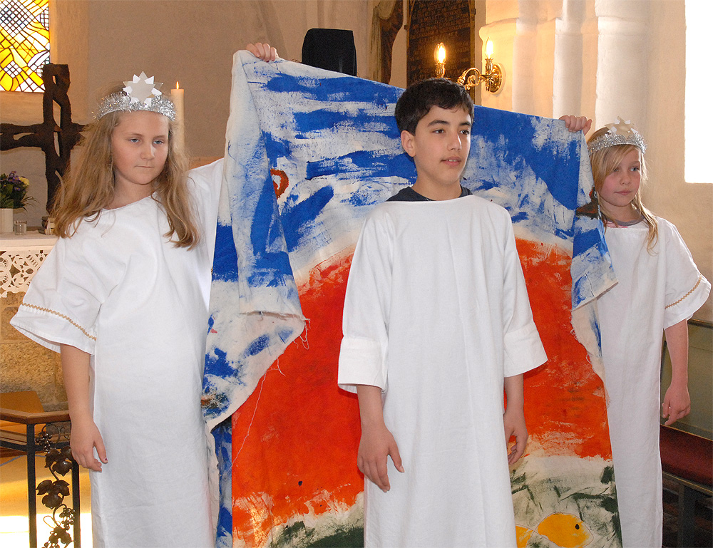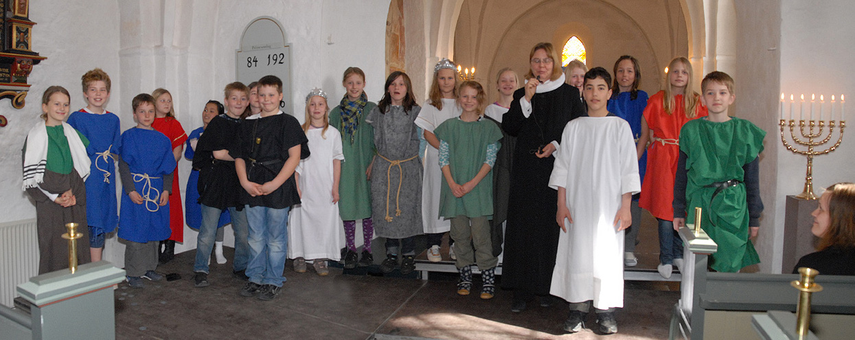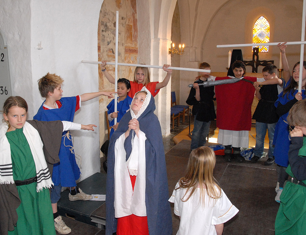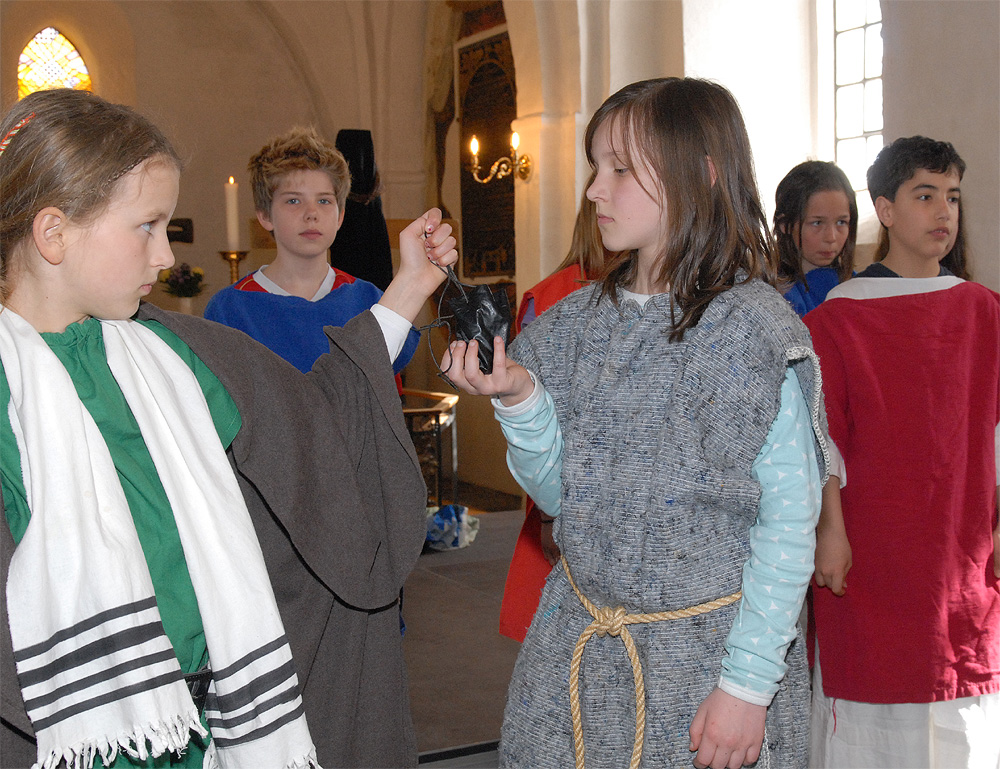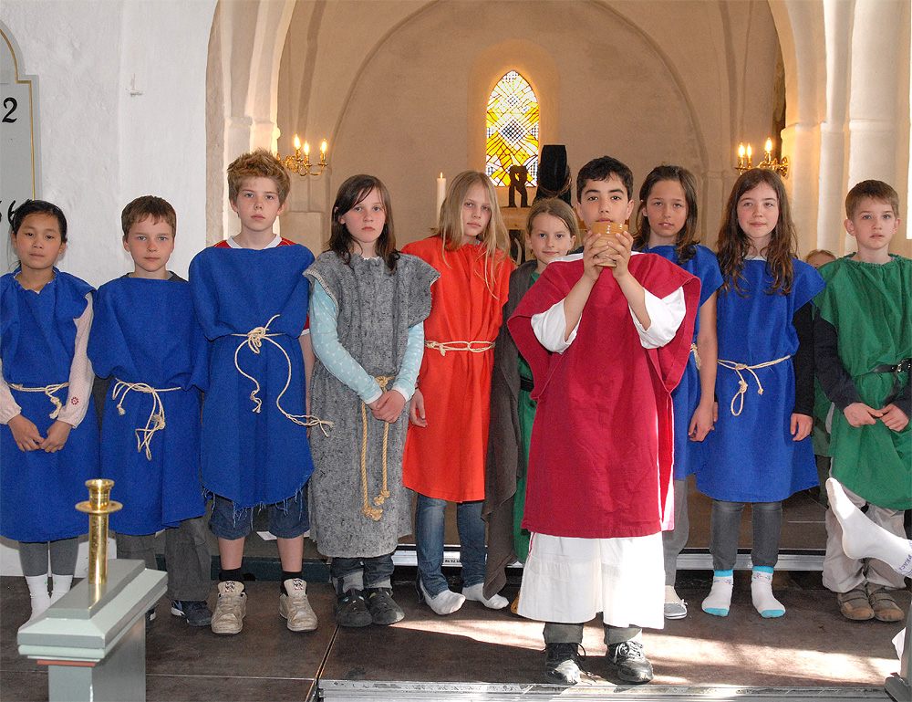 | Minikonfirmanderne fra 3.c og 3.d på Mårslet Skole opførte ved familiegudstjenesten palme- søndag et påskespil med udgangspunkt i påskens budskab fra skærtorsdag til påskedag. Umiddelbart efter gudstjenesten var alle inviteret over i Sognehuset, til afslutning med kaffe/the, saft og kage. Alle minikonfirmanderne modtog her et diplom og en lille gave. foto og tekst: ©2009 Jørgen Lauritsen