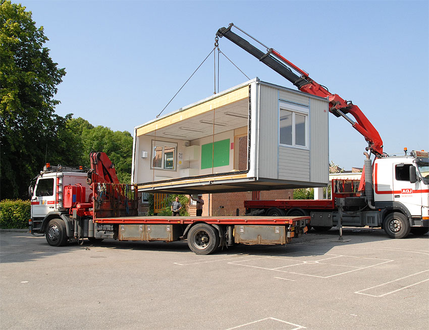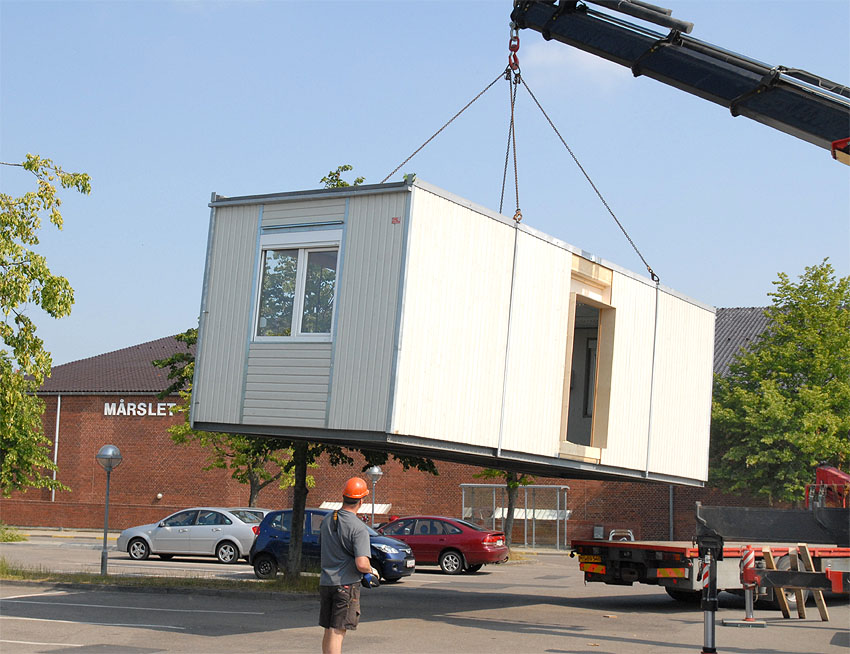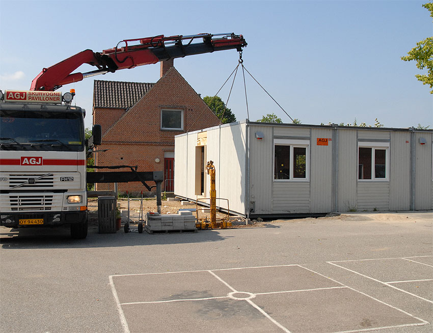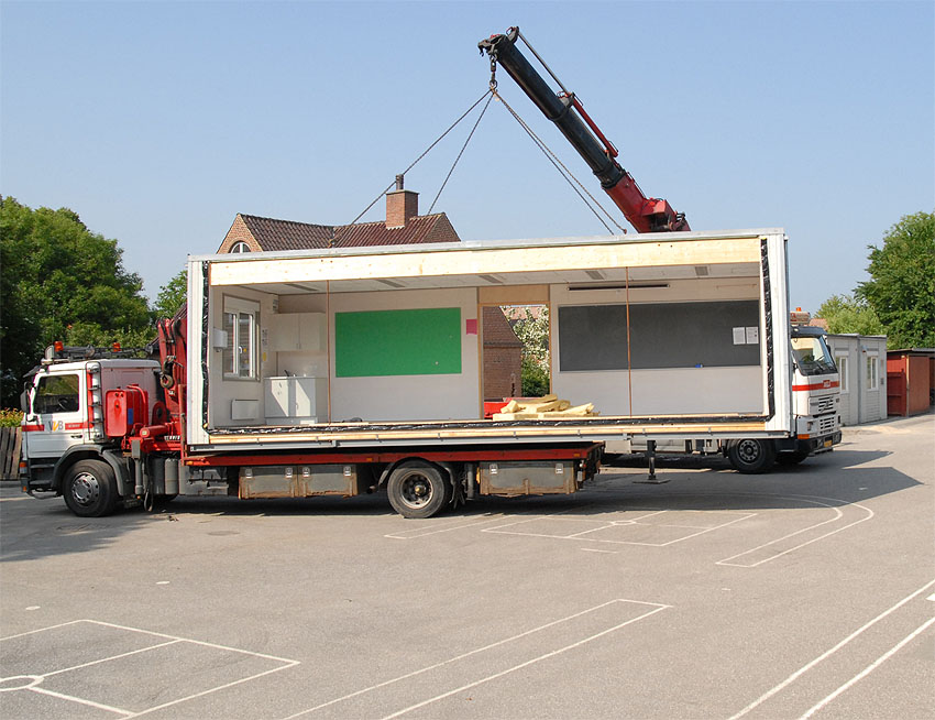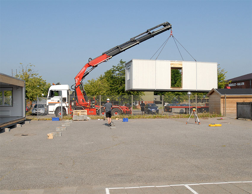 | Det første rigtigt synlige tegn på udvidelsen af Mårslet Skole sås i dag hvor pavillonerne, der gennem de sidste 2 år har været rammen om de mindste klasser, blev flyttet fra skolegården til pladsen ud mod Hallens parkeringsplads bag A-huset. En kran løftede hver af de 7 pavilloner op på en lastbil, der i fast rutefart kørte til en anden kran, der sørgede for at de blev korrekt placeret. En operation på mindre end 6 timer. Pavillonerne bliver efter sommerferien og det næste år klasseværelser for 2.a og 2.e. I uge 29 væltes pedelboligen, og så er der fri plads til udvidelsen.. foto: ©2009 Jørgen Lauritsen