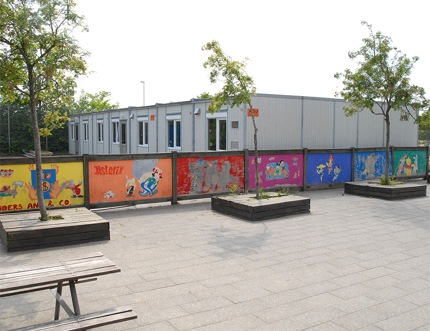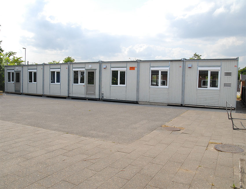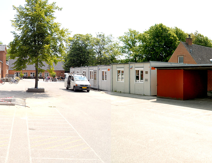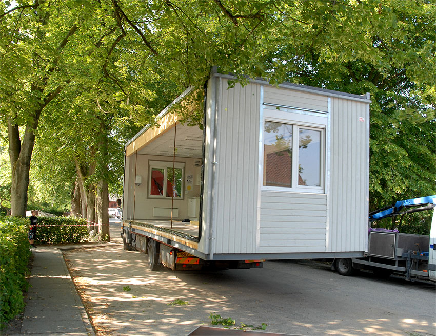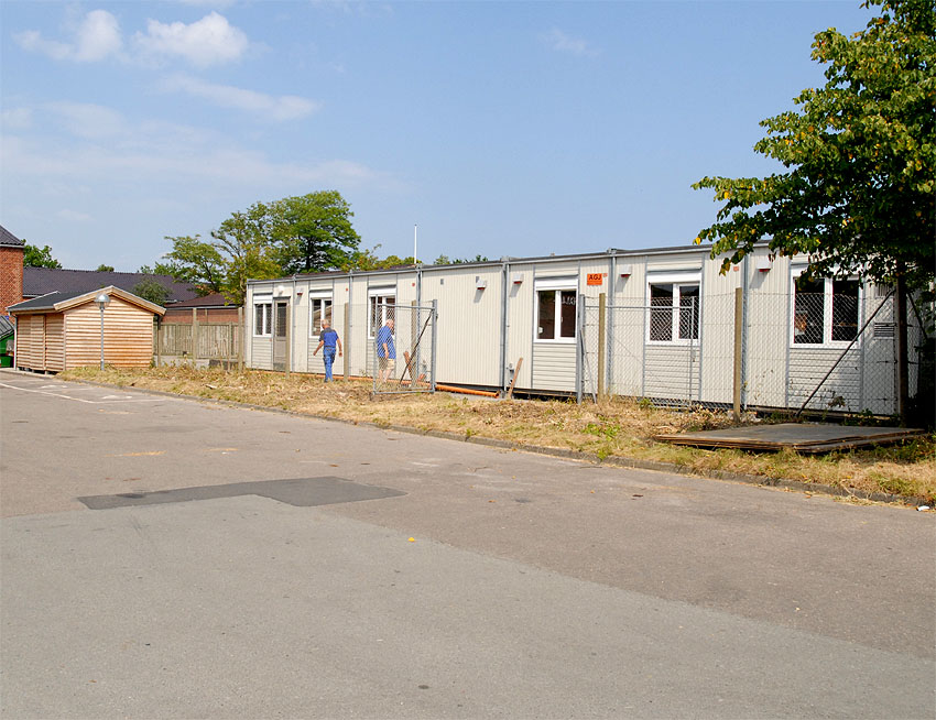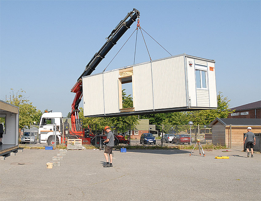 | Det første rigtigt synlige tegn på udvidelsen af Mårslet Skole sås i dag hvor pavillonerne, der gennem de sidste 2 år har været rammen om de mindste klasser, blev flyttet fra skolegården til pladsen ud mod Hallens parkeringsplads bag A-huset. En kran løftede hver af de 7 pavilloner op på en lastbil, der i fast rutefart kørte til en anden kran, der sørgede for at de blev korrekt placeret. En operation på mindre end 6 timer. Pavillonerne bliver efter sommerferien og det næste år klasseværelser for 2.a og 2.e. I uge 29 væltes pedelboligen, og så er der fri plads til udvidelsen.. foto: ©2009 Jørgen Lauritsen