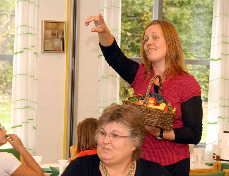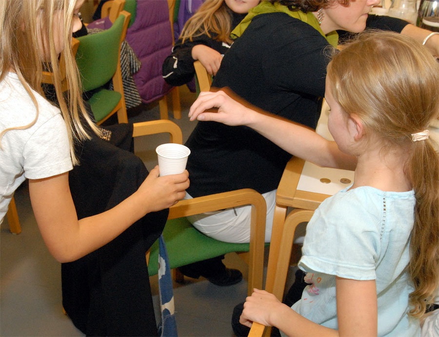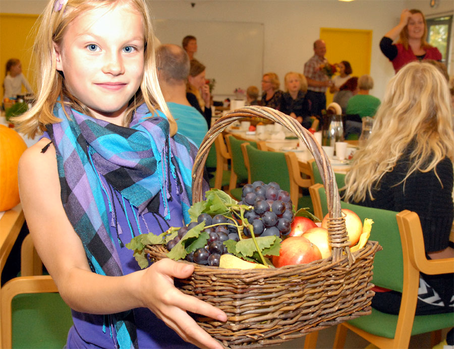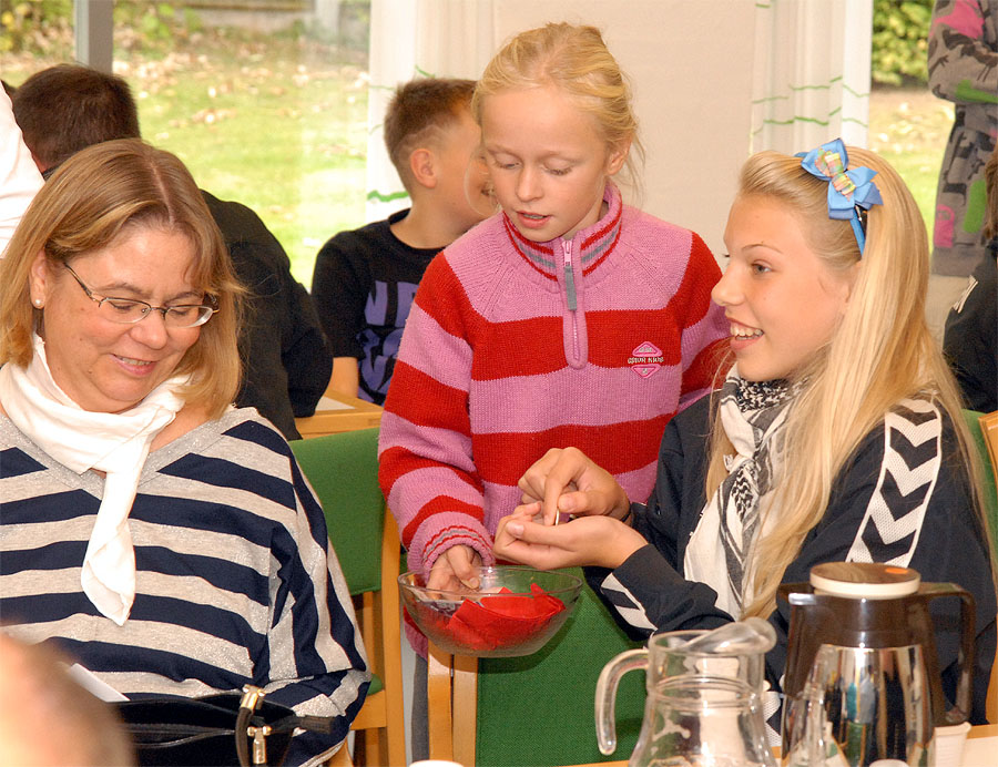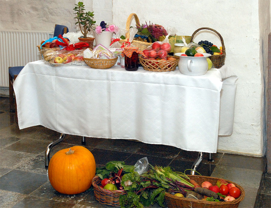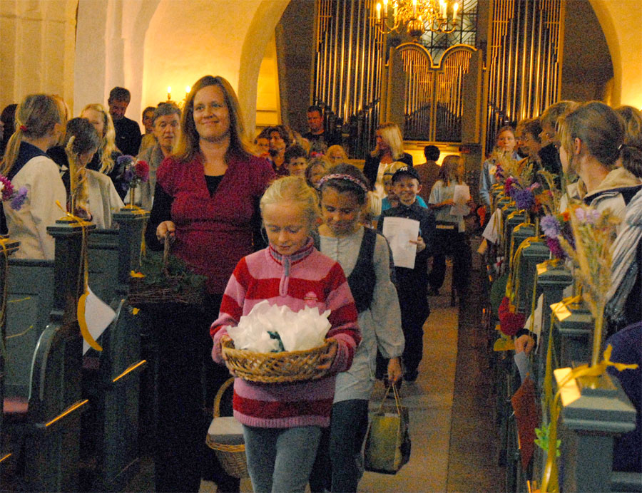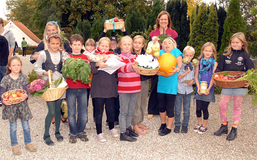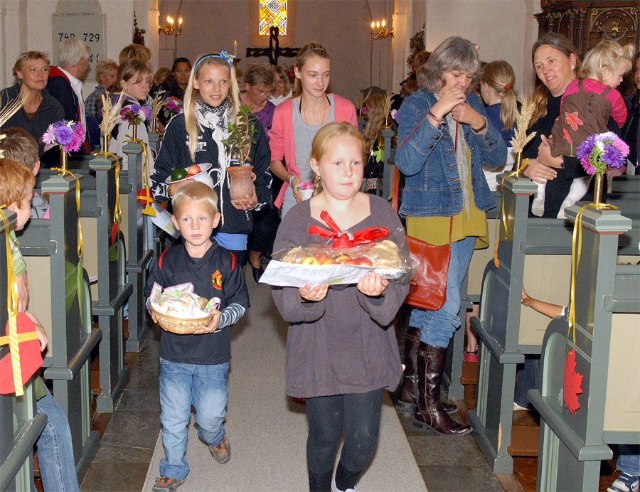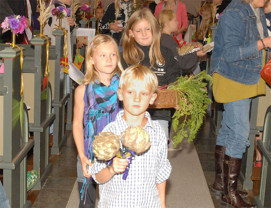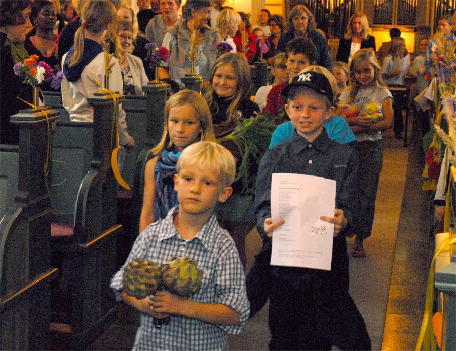 | Ved høstgudstjenesten, søndag den 27. september, bar minikonfirmanderne høstgaver ind i kirken. Ved den efterfølgende sammenkomst i Sognehuset blev de bortloddet ved fornøjelig auktion. Der indkom ialt 1.726 kr. der går til Folkekirkens Nødhjælp. foto og tekst: ©2009 Jørgen Lauritsen