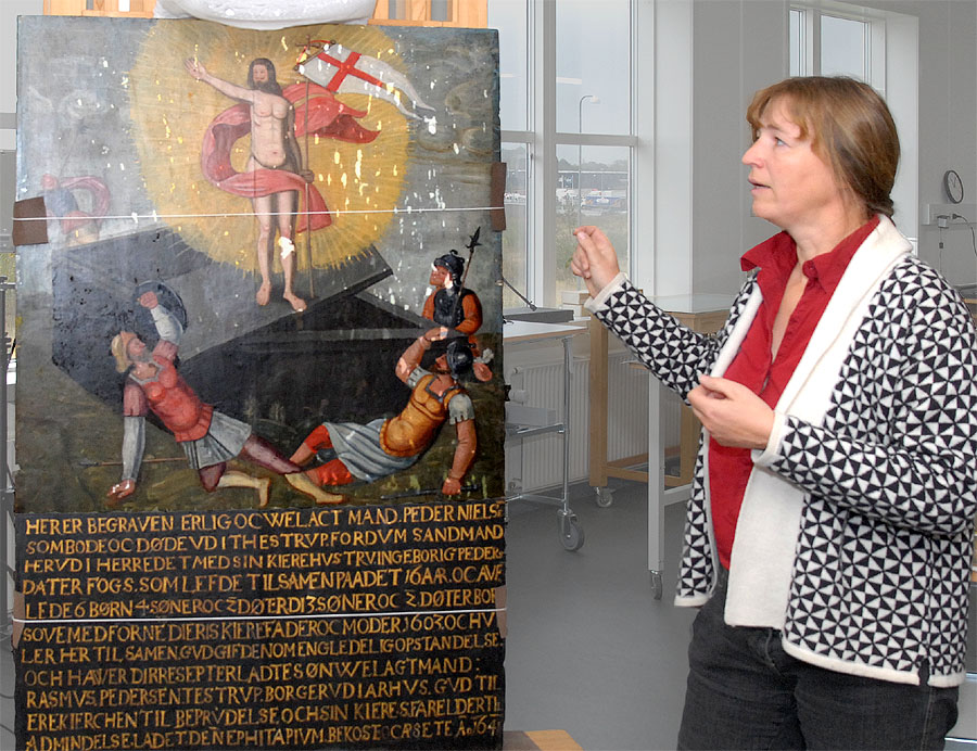 | Epitafiet på nordvæggen i Mårslet Kirke der oprindeligt blev opsat i 1641 af Rasmus Pedersen Thestrup , har i over to år været plastret til med mange små lapper af japanpapir, der skulle forsegle og beskytte mod en begyndende afskalning af maleriet. Den 15. juni 2009 blev hele epitafiet forsigtigt taget ned og med specialtransport overført til Konserveringscentret i Vejle, der skal stå for en komplet restaurering. Lørdag den 3. oktober 2009 var Mårslet Menighedsråd med flere inviteret til Vejle for at se, hvor langt arbejdet var nået. Centrets leder Lise Ræder Knudsen fortalte om de overordnede teknikker og metoder, der anvendes, og malerikonservator Satiness Schwindt (billedet herunder) demonstrerede derefter, hvordan det er muligt at udbedre de hundreder af små defekter i både maleri og træværk. Arbejdet forventes afsluttet sidst på året. foto og tekst: ©2009 Jørgen Lauritsen