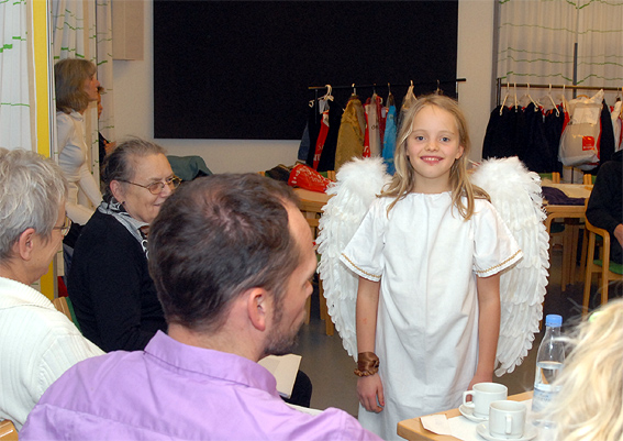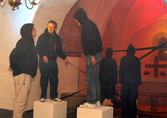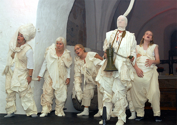 Uhyggelige kvium-agtige tabere spreder frygt - Pilatus bowler og levende statuer rystes - oprørerne ligner en flok autonome i hængerøvsbukser - snerpede kvinder vrænger ad moderne tider - en engel kommer svævende gennem kirkerummet - en kornhandler er totalt i vildrede, men en lille frækkert af en dreng har vist forstået mere end de fleste. Galilæerens Skygge blev, foruden en generalprøve for de kommende konfirmander, opført ved ialt 9 forestillinger. Fire gange den 14. - 15. november, en lukket forestilling den 20. november og fire gange den 21. - 22. november. Billetpris var sat til 100 kr. for voksne og for børn under 18 år, 50 kr. På grund af omfanget af det tekniske udstyr - lys og lyd - havde det været nødvendigt at inddrage en del kirkebænke, så antallet pladser i kirken var reduceret omkring 100. Historien: Kornhandleren Andreas arresteres ved en fejltagelse under en demonstration mod Pilatus. Han afhøres, og Pilatus tilbyder ham frihed mod at han bliver spion for den romerske besættelsesmagt. Et oprør er på vej, ledet af en vis Jesus fra Nazaret. Andreas opgave er at finde ud af, hvor farlig denne Jesus er. Udgør han en aktuel sikkerhedsrisiko for de jødiske og romerske myndigheder? Er han religiøs ekstremist? Er han terrorist? Andreas rejser som Jesus skygge, og opdager at denne Jesus er dødsensfarlig for både besættelsesmagten og de jødiske myndigheder. Men på en helt anden måde end han selv og disse myndigheder er klar over. For Jesus prædiker en usynlig revolution, en sjælens revolution, som ingen jordisk myndighed kan styre, for Jesus siger: Gudsrige er allerede iblandt jer og verden er radikalt forandret! Flere sogne i Århus syd havde givet økonomisk støtte, såvel som fra bl.a. Folkekirkens Udviklingsfond, Århus Stiftsfond, FO i Århus, Knud Tågholts Fond, DATS, Landsforeningen for Dramatisk Virksomhed, Y-Mens Club og Grønløkke Aftenskole. Åben Himmel har flere store produktioner af kirkespil bag sig, hvoraf de mest kendte er Tåbernes Testamente (1998) og Legenden om De Tre Ringe (2002). ![]()