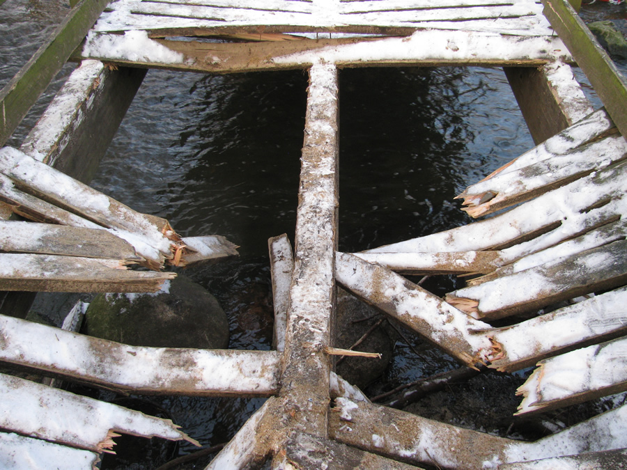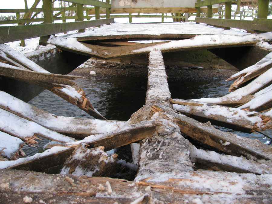 | Broen over Giber Å brasede sammen i juledagene, da en sneskraber kørte over den. Broen er helt central i morgentrafikken til og fra skole. Derfor har Fællesrådet allerede været i dialog med Trafik og Veje om, hvad der sker. Trafik og Veje er godt klar over problematikken, og der vil allerede i starten af ugen blive bestilt træ hjem. foto: ©2010 Keld Schmidt-Møller
