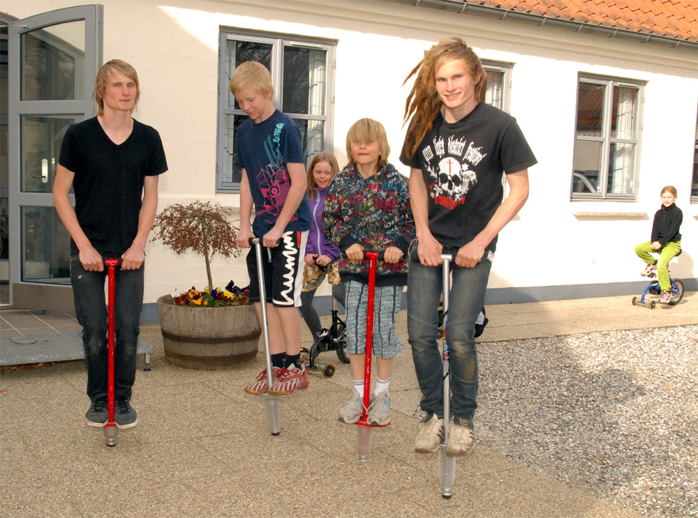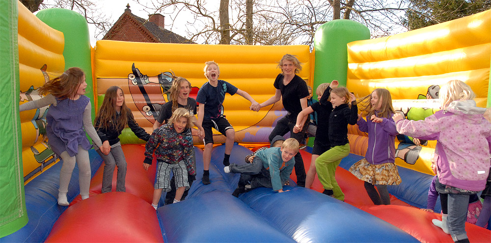 Det var store legeeftermiddag ved Sognehuset mandag den 19. april 2010. Kl. 16:15 ankom Evigglad rullende ind på gårdspladsen og kort tid efter rejste der sig en stor hoppeborg på græsplænen. Og der var gang i kængurustylter og ethjulede cykler - med støttehjul! Der er i dag så mange tilbud til børn og unge, at der mærkes en vigende interesse for de kirkelige ungdomsorganisationer. Her kommer Evigglad ind i billedet. Den rullende legeplads, der kører over hele landet, har bl.a. til opgave at udbrede kendskabet til Danmarks Folkekirkelige Søndagsskoler. Efter et par timer var det hele forbi, og vogntoget rullede videre til et nyt sted i landet. Foto: Jørgen Lauritsen ©2010