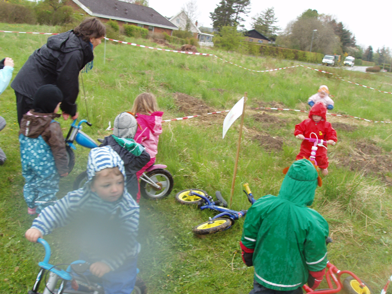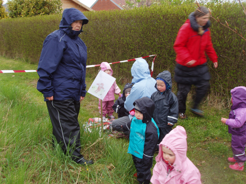 | Hvert år den 2. onsdag i maj er det Dagplejens Dag i hele landet. Det blev også fejret af børn og dagplejere her i Mårslet. De to dagplejergrupper skiftes til at arrangere dagen og i år stod gruppe 14 bag en Peter Pedal-fest. Dagen startede kl. 9.30, hvor det lige var begyndt at dryppe, men det stoppede ikke de regnglade dagplejebørn. De mindste kunne stå i læ under to pavilloner. Der blev sunget "Der var engang en abe", dernæst den til lejligheden lavede sang om Peter Pedal og sidst "Oppe i lianerne". Herefter var der syv stationer, man kunne besøge: - Cykel gennem en labyrint (slået med plæneklipper i højt græs) - Byg avisskibe med Peter Pedal - Prøv en forhindringsbane - Smag hvad Peter Pedals livret er - Find kokosnødder i en stor sanddynge - Flyv med drage (løb på en vold med plastpose med snor) - Find junglens dyr i et træ Til slut blev der serveret pitabrød med frikadeller og naturligvis abemad (frisk frugt). foto: ©2010 Mette Pedersen