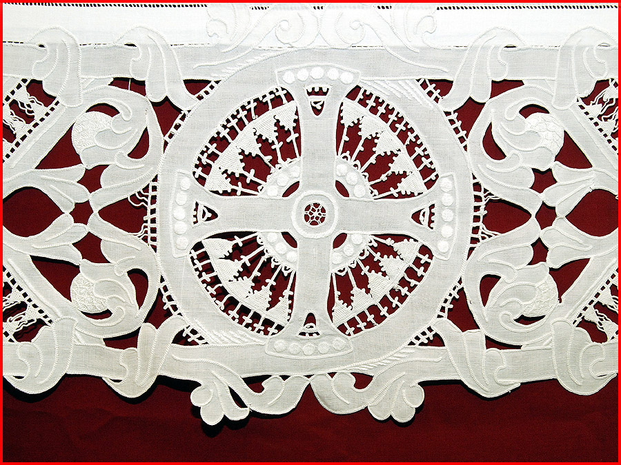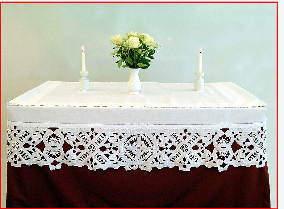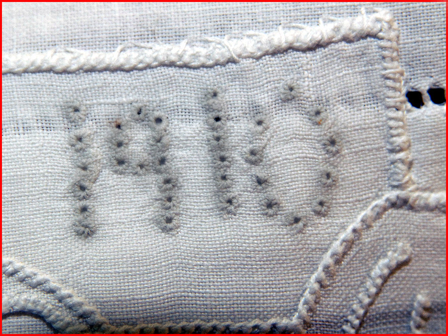 Diskret i et hjørne er årstallet på alterdugens færdiggørelse broderet med små stjernesting. (Her fremhævet i mørk nuance for tydeliggørelsen)