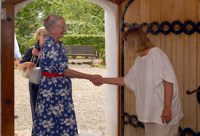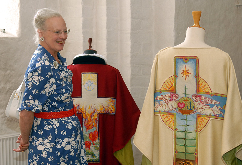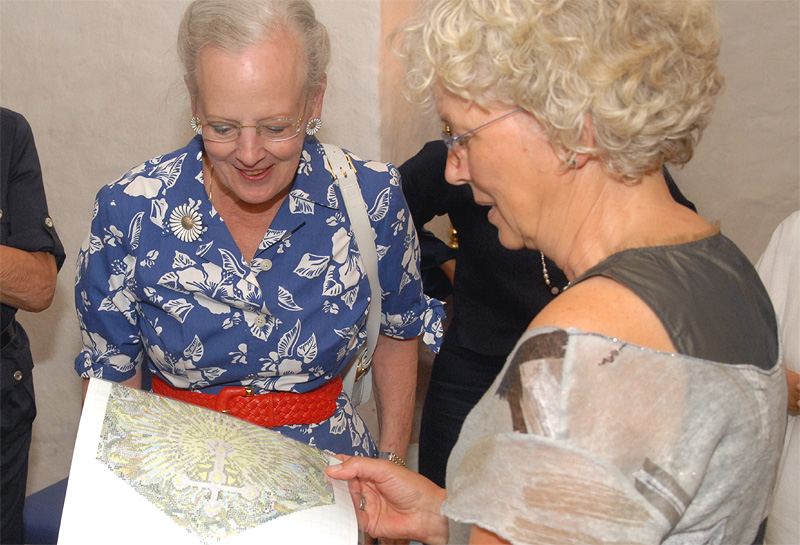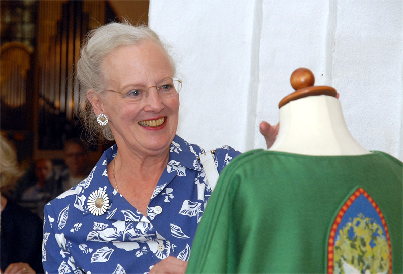| Dronning Margrethe havde ønsket at se de fire messehageler, som over en årrække er blevet fremstillet af lokale mårsletborgere, og tirsdag den 13. juli kl. 15 besøgte hun Mårslet Kirke og blev modtaget af sognepræst Hanne Davidsen og de brodeuser, der havde stået for udførelsen. Ved projektets afslutning i 2009 blev der udgivet en lille bog, der i detaljer beskriver messehagelerne og deres tilblivelse, og det var efter at have set denne udgivelse, at dronningen, der selv har designet messehageler bl.a. til Århus Domkirke, havde udtrykt ønske om et besøg i kirken og med egne øjne se, hvad vi her i Mårslet havde formået. Dronningen udtalte sig i begejstrede vendinger om motivernes detaljerigdom og farvernes sammensætning og var imponeret over det store engagement, der var udvist af de mange frivillige, uden hvis indsats det hele ikke havde kunnet lade sig gøre. Besøget varede en lille times tid, hvorefter dronningen igen returnerede til Marselisborg Slot. foto: ©2009 Jørgen Lauritsen