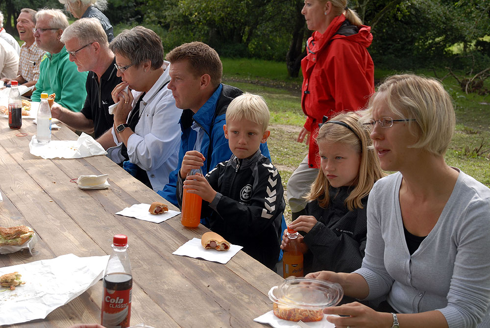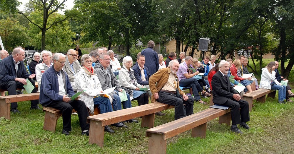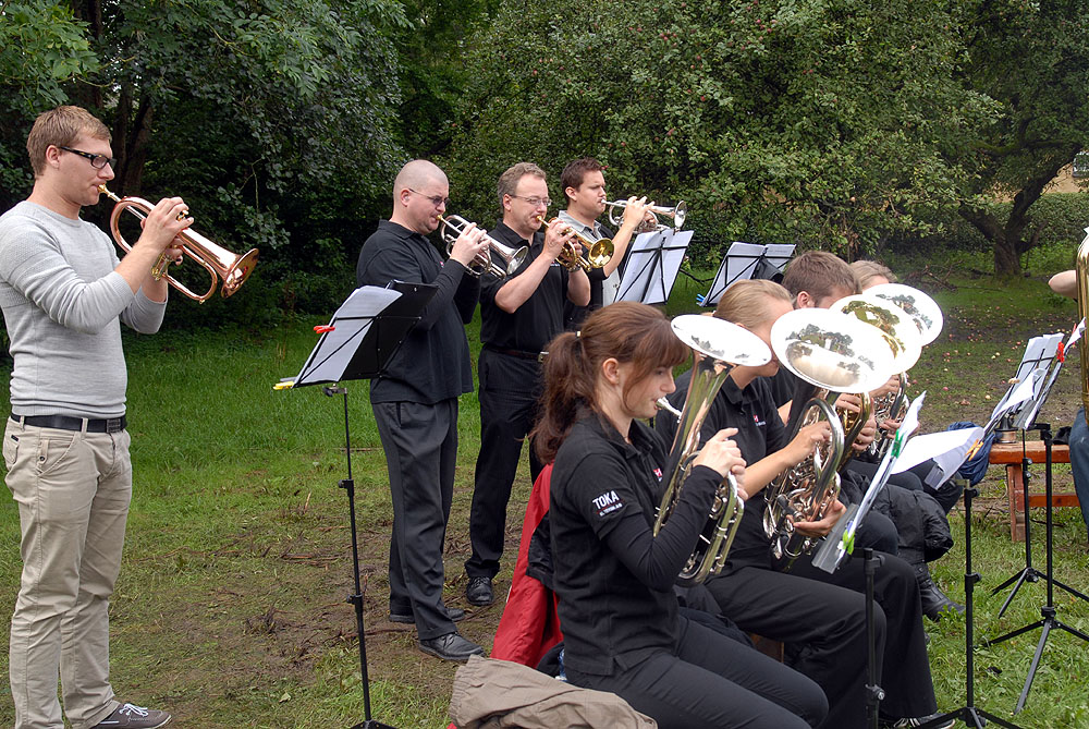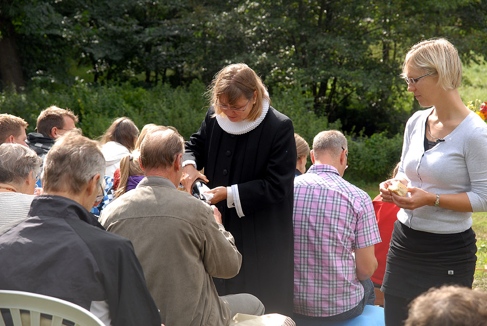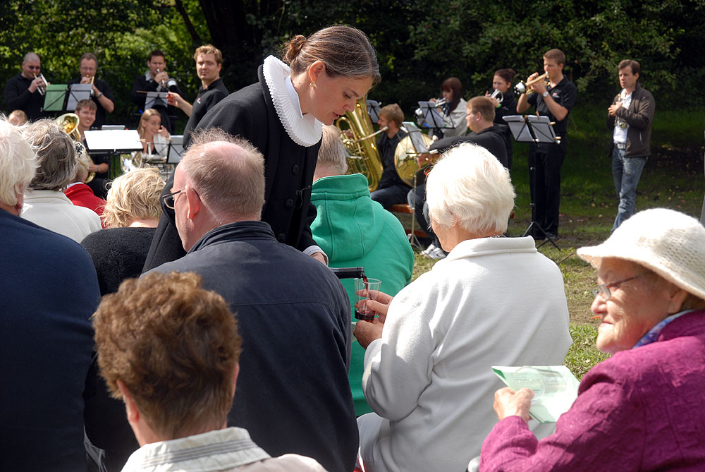 Den megen regn, de truende skyer og kræmmermarkedet dagen før havde sat sit spor på græsarealet, så betingelserne var ikke de bedste, men mange havde alligevel lagt vejen forbi - enkelte endda helt fra Randers! Jens Beck og Susanne Lunderskov læste og sognepræst Hanne Davidsen prædikede over temaet Paradisiske øjeblikke, som vi alle kan være opmærksomme på og opleve dem i vor fortravlede hverdag. Nadveren - rødvin fra Brugsen og brød fra bager Makaros - blev forestået af Mårslets nye sognepræst Mette Maria Kristensen*) og for musikledsagelsen stod Århus Brass Band. Efter gudstjenesten brød solen frem, og så var der fællesspisning i det - trods alt - grønne. *) Mette Maria Kristensen er fra den 1. september ansat i en 50% stilling og indsættes ved gudstjenesten søndag den 12. september kl. 10:00. (Foto og tekst: Jørgen Lauritsen ©2010)