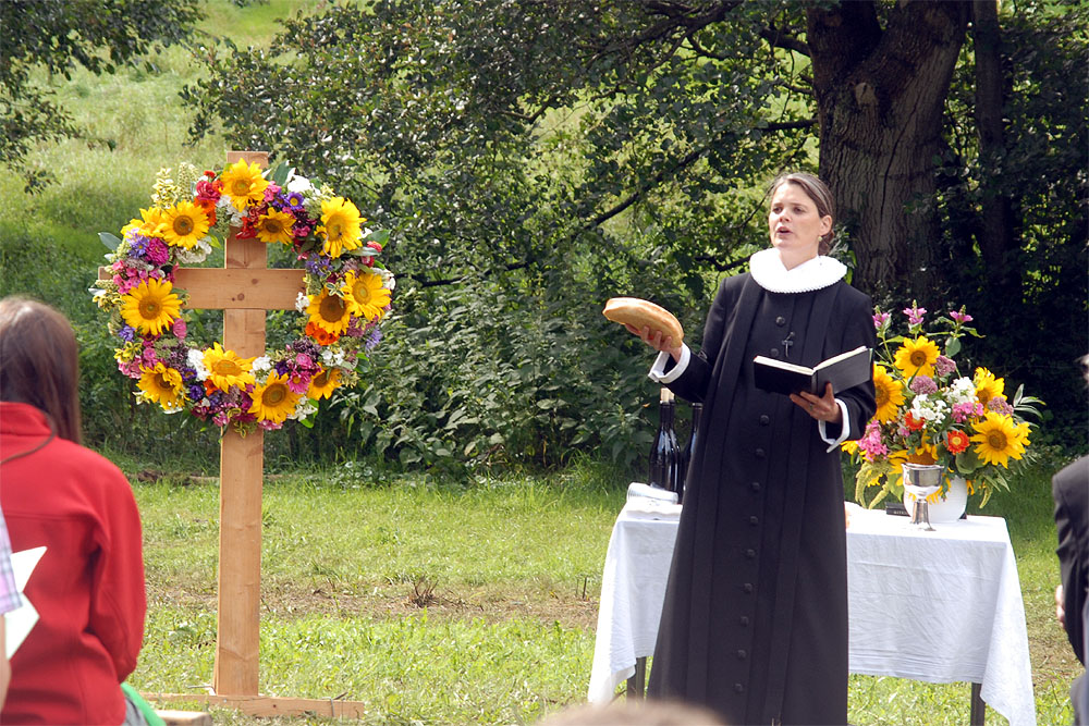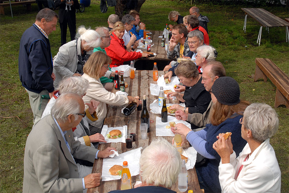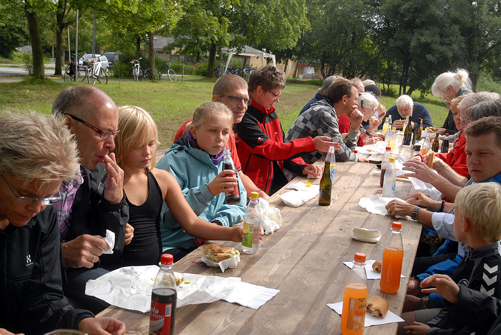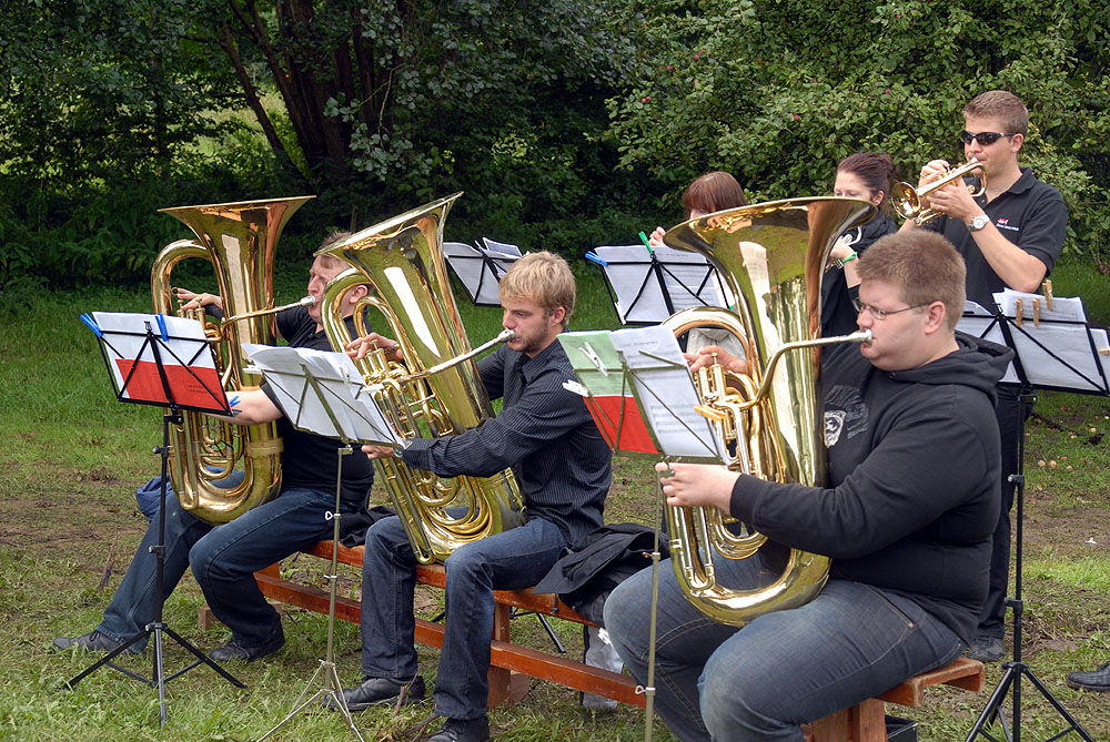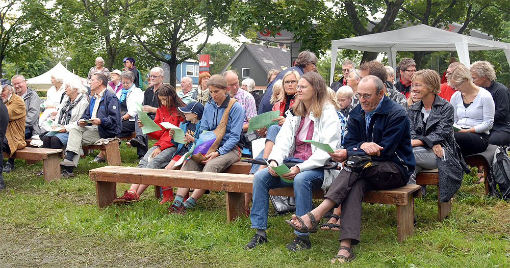 Den megen regn, de truende skyer og kræmmermarkedet dagen før havde sat sit spor på græsarealet, så betingelserne var ikke de bedste, men mange havde alligevel lagt vejen forbi - enkelte endda helt fra Randers! Jens Beck og Susanne Lunderskov læste og sognepræst Hanne Davidsen prædikede over temaet Paradisiske øjeblikke, som vi alle kan være opmærksomme på og opleve dem i vor fortravlede hverdag. Nadveren - rødvin fra Brugsen og brød fra bager Makaros - blev forestået af Mårslets nye sognepræst Mette Maria Kristensen*) og for musikledsagelsen stod Århus Brass Band. Efter gudstjenesten brød solen frem, og så var der fællesspisning i det - trods alt - grønne. *) Mette Maria Kristensen er fra den 1. september ansat i en 50% stilling og indsættes ved gudstjenesten søndag den 12. september kl. 10:00. (Foto og tekst: Jørgen Lauritsen ©2010)