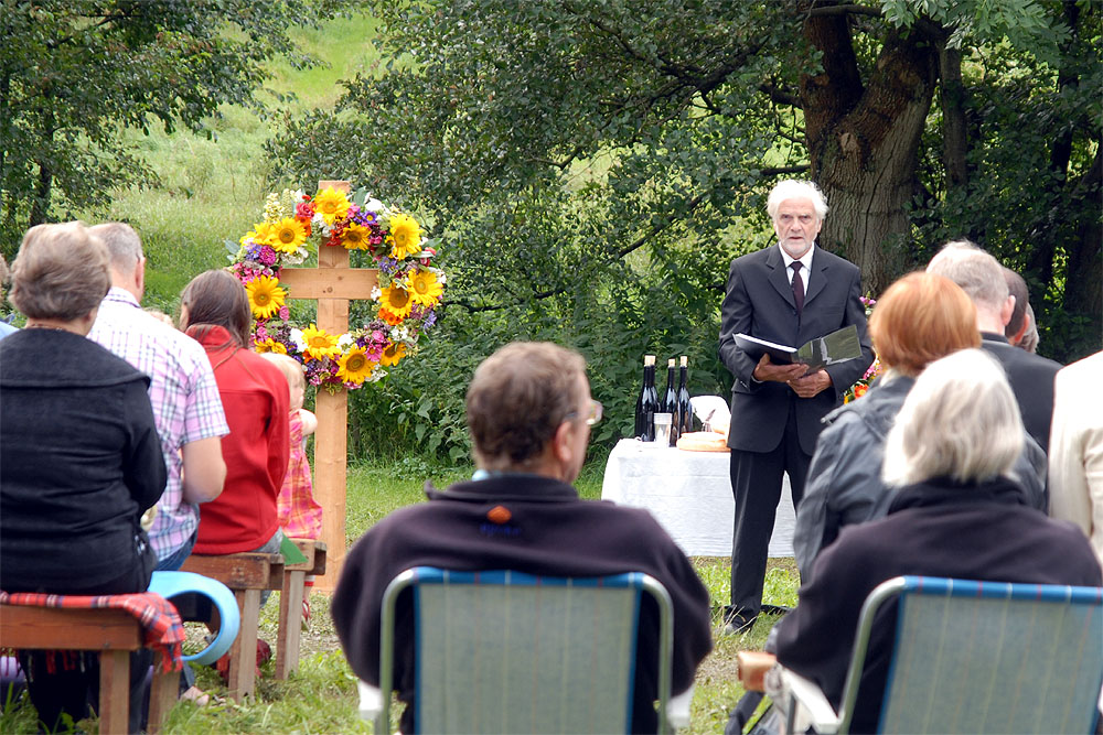 Traditonen tro blev der på den sidste dag i Mårslet Festuge holdt friluftsgudstjeneste i Bomgårdshaven.