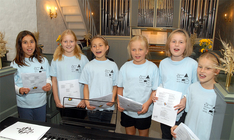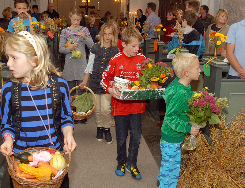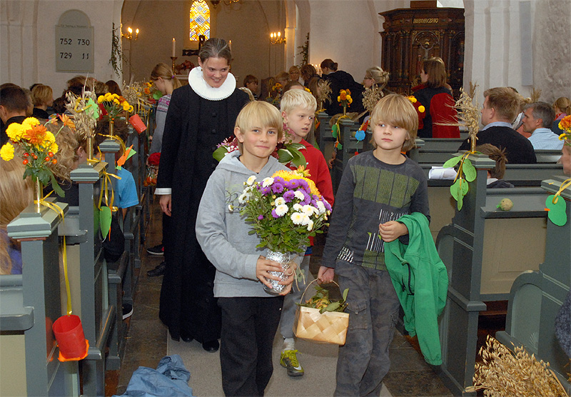 | Årets høst- og familiegudstjeneste blev fejret i en festligt pyntet Mårslet Kirke søndag den 3. oktober. Børnene bar høstgaver ind i kirken, og efter gudstjenesten, med Mårslets nye sognepræst Mette Maria Kristensen som prædikant, blev det hele solgt på auktion ved den efterfølgende sammenkomst i Sognehuset. Auktionen indbragte 2.011 kr., der går til Folkekirkens Nødhjælp. Se flere billeder på kirkens hjemmeside: link foto: ©2010 Jørgen Lauritsen