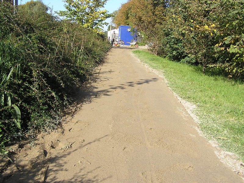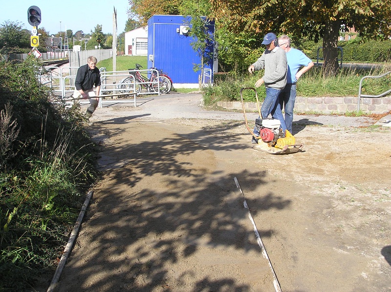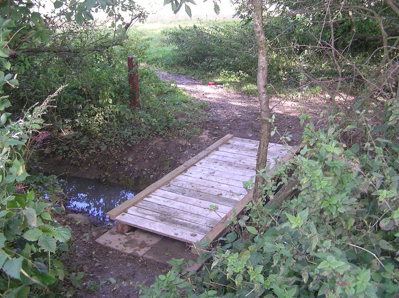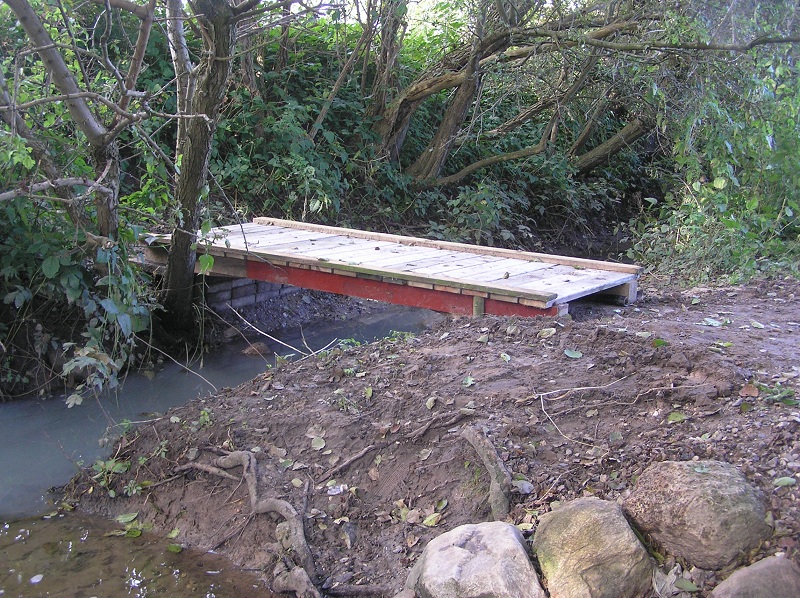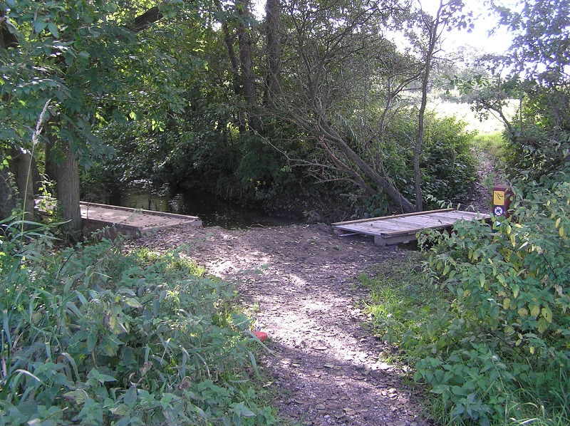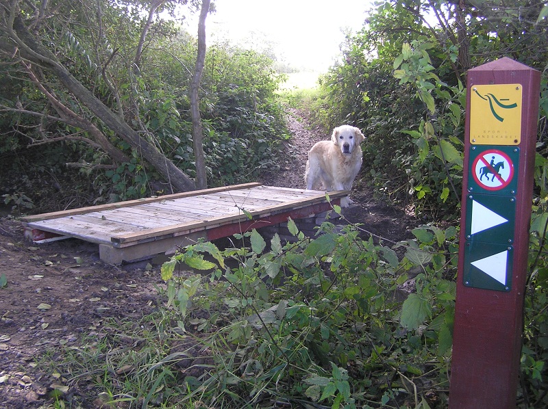| Broen over den lille bæk som munder ud i Giberen ved trampestien fra Langballevænget til Vilhelmsborg er desværre blevet taget af det meget regnvand, som er komme i sommeren løb. Men nu er der blevet etableret en ny bro på stedet. Aktive borgere fra Langballevej renoverede stien nord for stationen. foto: ©2010 Jacob Lind